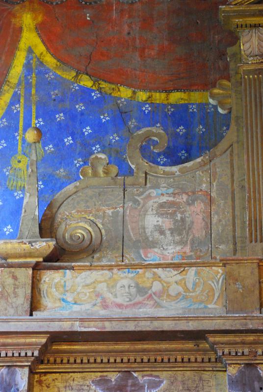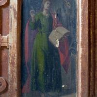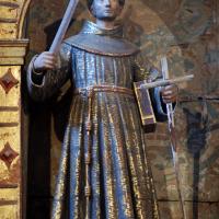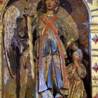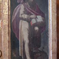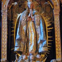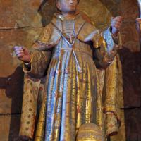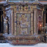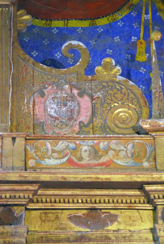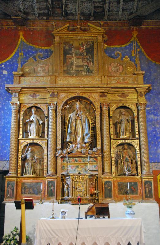 Retablo tetrástilo compuesto de banco, un único cuerpo y ático bastante desarrollado. El basamento muestra seis tablas de pincel con evangelistas y asuntos de la Infancia de Jesús. El cuerpo principal se organiza en tres calles con imágenes de bulto en las laterales que se completan con el tabernáculo en la central. Un entablamento compuesto de arquitrabe liso, friso con cabezas de querubes (desaparecidas) y cornisa con dentellones, da paso al ático. Este se alza sobre su propio basamento con una caja rectangular coronada por frontón triangular partido en el centro y dos aletones con pirámides vignolescas en los laterales. En su policromía, con algunos detalles pintados, predominan las superficies doradas.