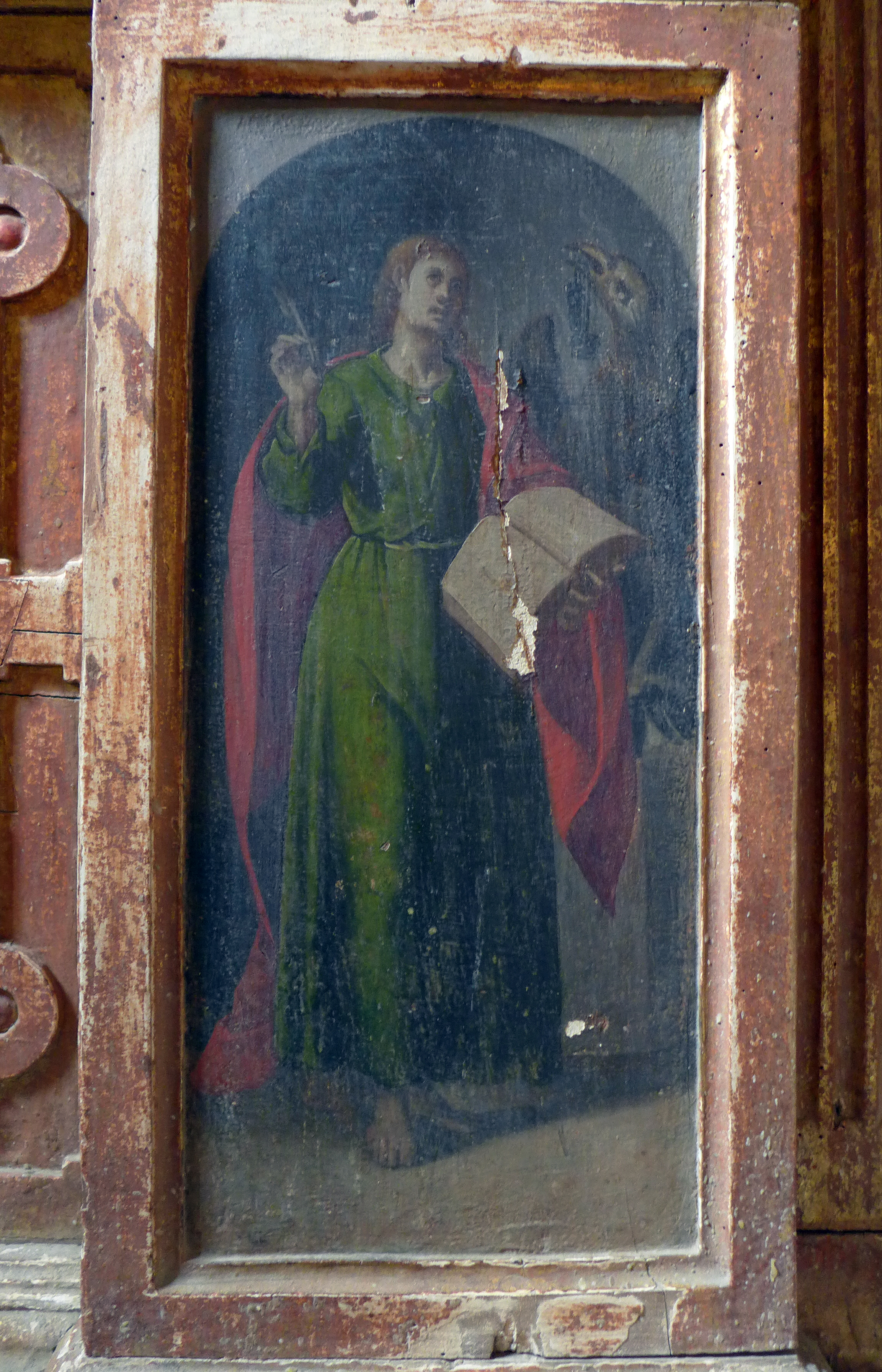 Pintura sobre tabla representando al evangelista San Juan. El santo aparece en pie, vestido con túnica verde que se ciñe a la cintura y manto rojo. En su mano izquierda lleva un libro abierto, mientras en diestra sujeta una pluma para escribir sobre el anterior. Su mirada a las alturas parece buscar inspiración divina. Se acompaña, a la derecha, de un águila, su símbolo en el Tetramorfos.