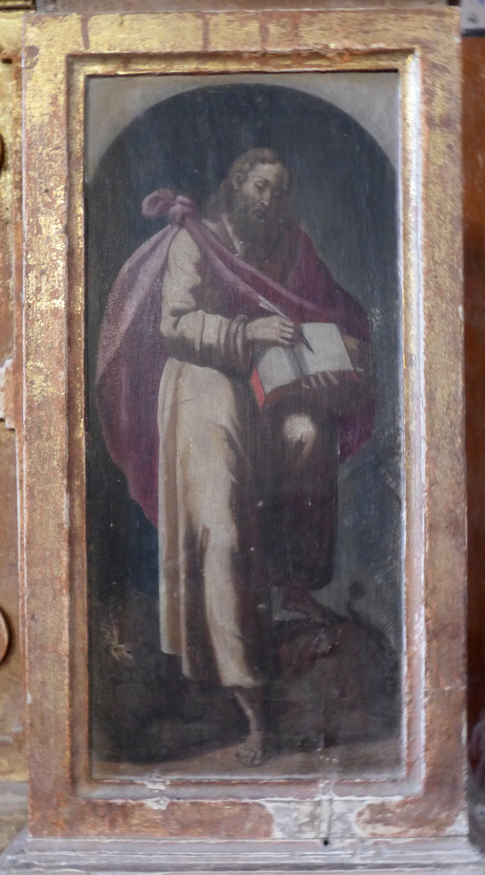 Pintura sobre tabla representando al evangelista San Marcos. El santo aparece en pie, aunque su pie derecho se levanta para apoyarse sobre el lomo del león que aparece a sus pies, su símbolo en el Tetrarmorfos. Viste túnica ocre y manto rosáceo que se anuda sobre su hombro derecho. Se dispone en actitud de escribir, por lo que en su mano izquierda lleva un libro abierto y en la derecha una pluma. Dirige su mirada hacia el libro y se muestra concentrado en su tarea de evangelista.