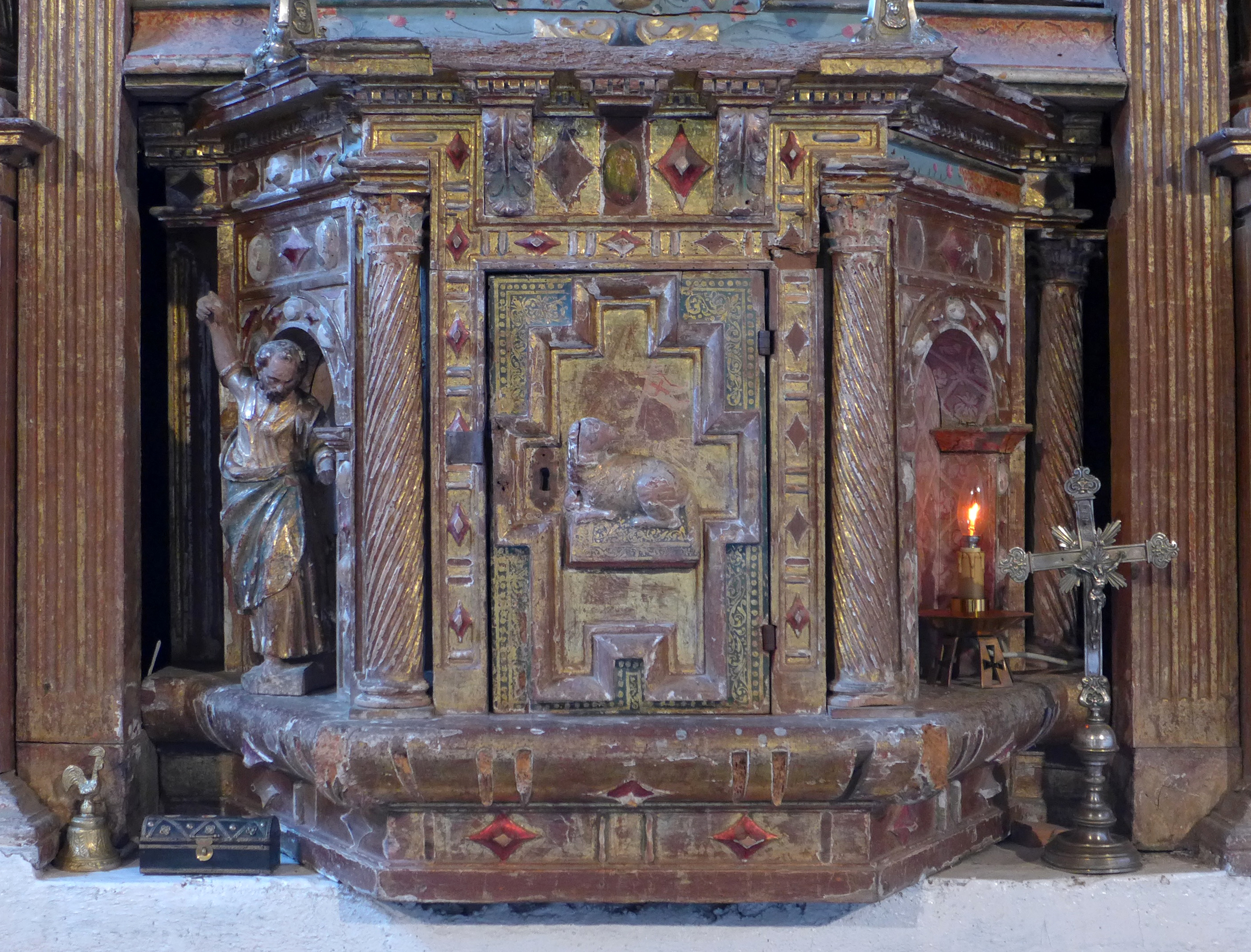 Pieza de mobiliario litúrgico de forma ochavada ubicada en la parte inferior de la calle central del retablo. Su estilo va en consonancia con el resto de la máquina, donde abundan esa característica labor de piedras y gallones o los perfiles movidos y quebrados. Sus tres paños se articulan a base de columnas entorchadas de cestas corintias. En los laterales irían sendas esculturas de apóstoles (de las que sólo se conserva una) y en centro se abre la puerta. Basamento y cornisa van cuajados de los ya mencionados ornatos, tan característicos a partir del segundo cuarto del siglo XVII.
