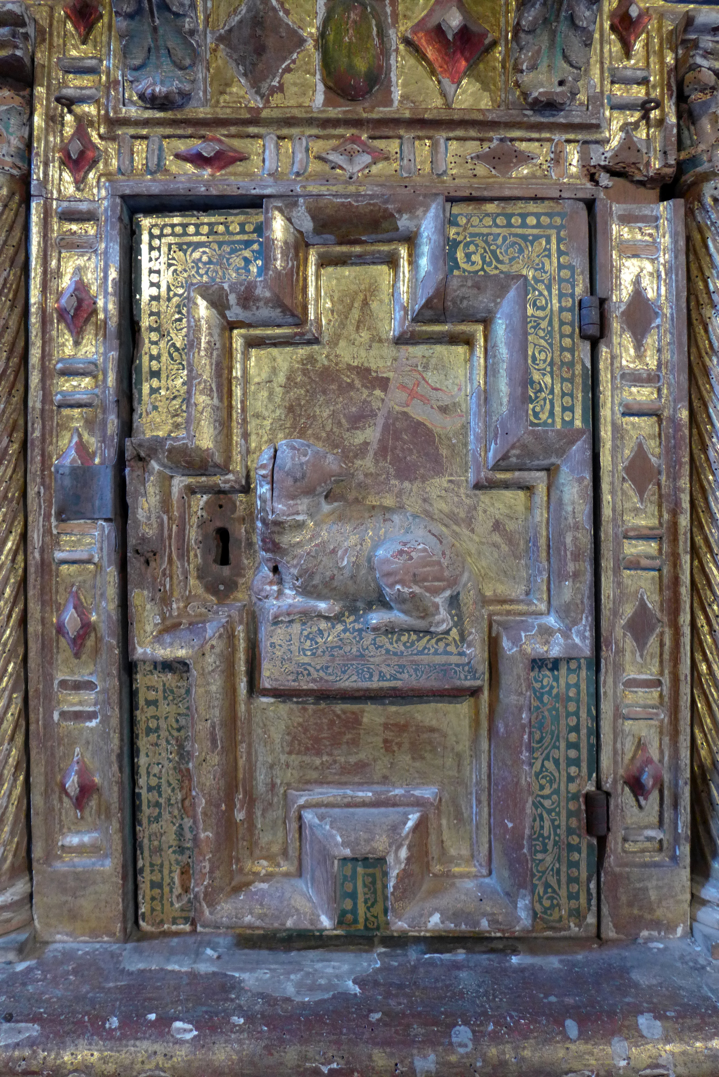 Puerta rectangular con marco de piedras y gallones. La parte móvil muestra una composición de perfiles geométricos con el Agnus Dei en su interior y una serie de estofados geométricos y fitomorfos en su exterior. Ha perdido el embellecedor de su cerradura.