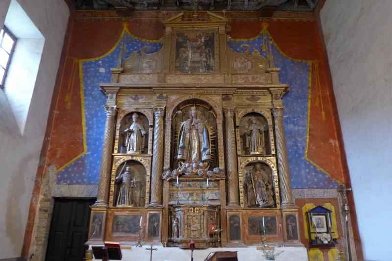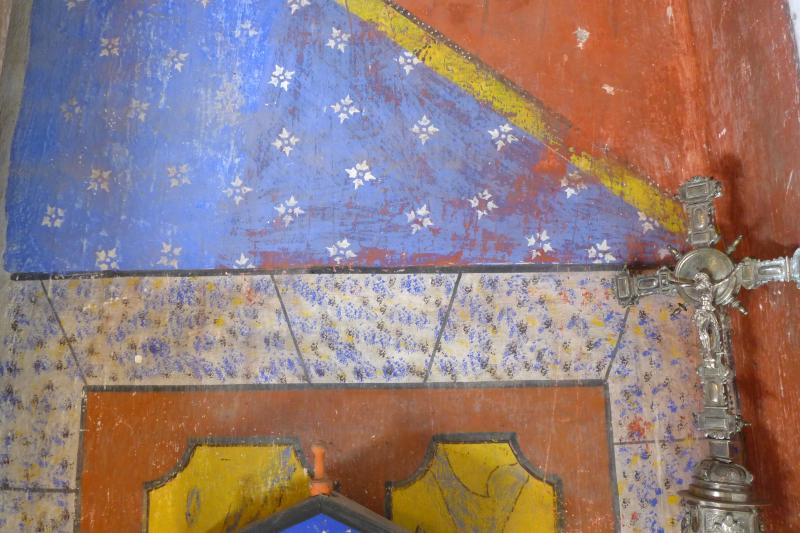 Pintura de carácter popular de tipo trampantojo. Representa unos falsos cortinajes, parcialmente recogidos, que dejan ver un fondo de florones y dos puertas en su parte inferior. Las cortinas son de color rojizo con orillo dorado y cordones con borlas del mismo color. El fondo es azul y sus flores, estampillados, blancos. Las referidas puertas corresponden a la sacristía (a la izquierda) y a una puerta fingida en la derecha con ensamblaje marrón y cuarterones amarillos. Ambas llevan un marco que finge despiece de dovelas.