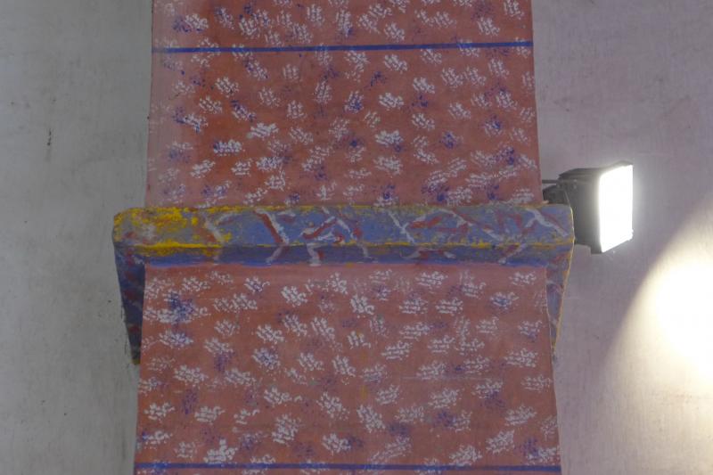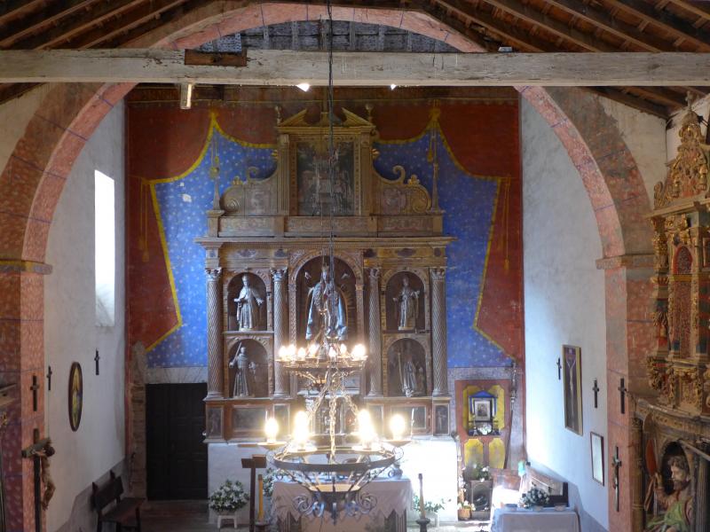 Pintura de carácter popular de tipo trampantojo. Se desarrolla alrededor de la rosca, intradós y extradós del arco de Gloria. Sobre un fondo rosado se realiza un despiece de sillares y dovelas fingido marcado en añil y en cada uno de ellos una serie de manchas blancas estampilladas.