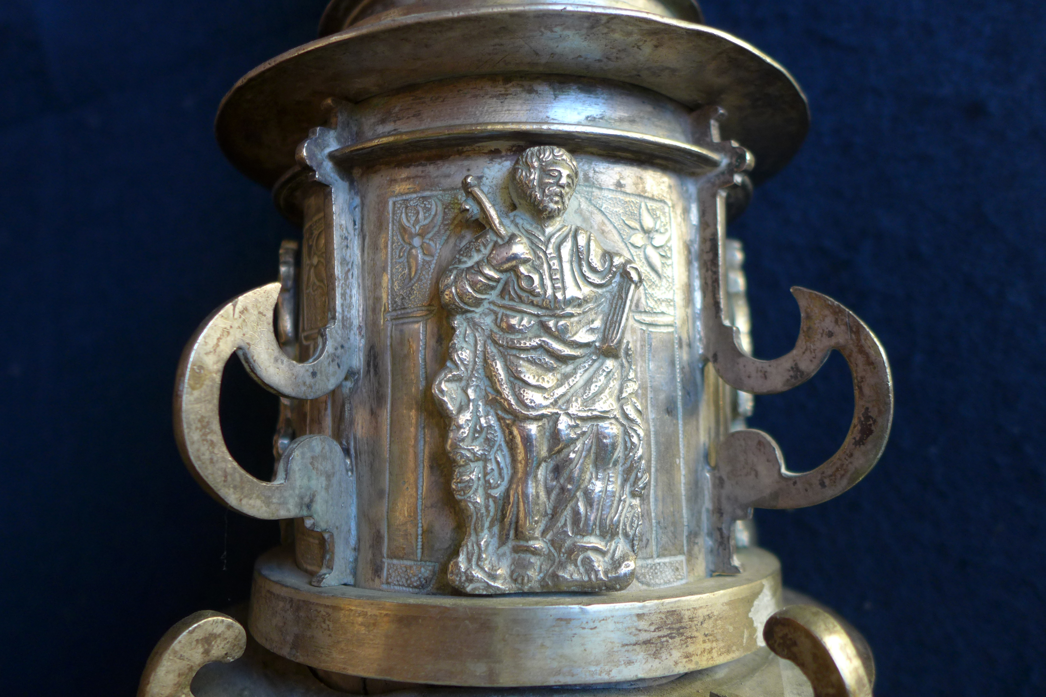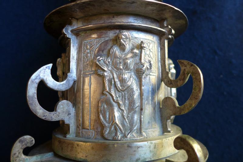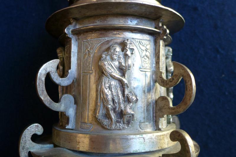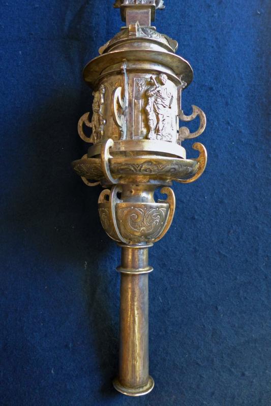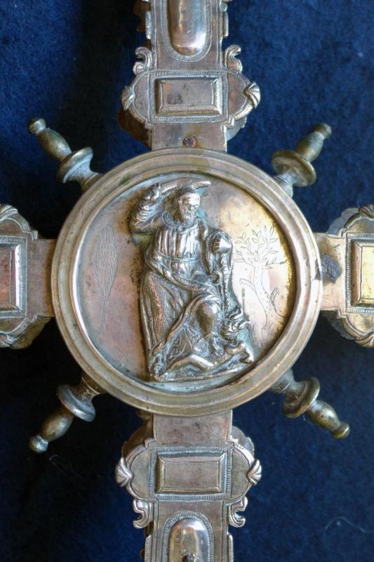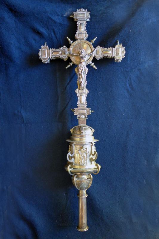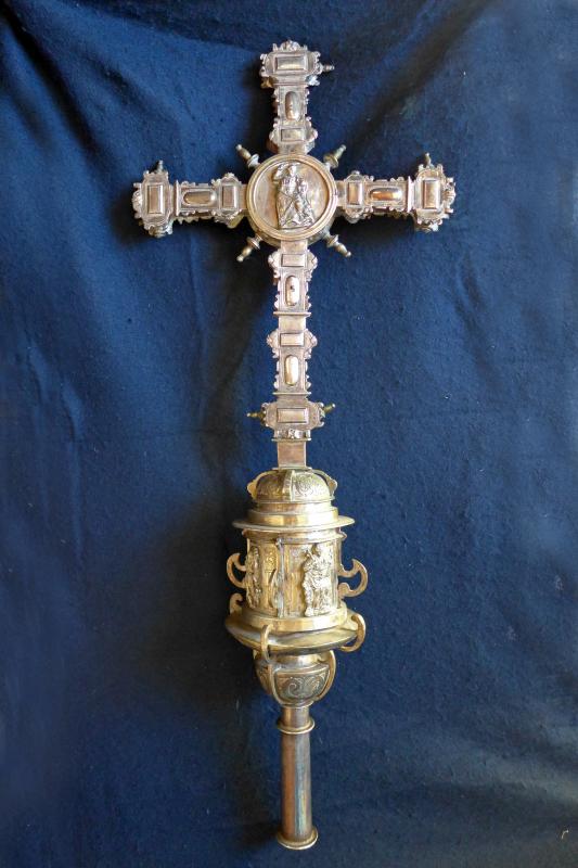 Cruz procesional de plata compuesta de árbol y macolla preparada para enmangar en un varal. La cruz, de forma latina, se acoge a la forma y ornatos más habituales a partir del segundo cuarto del siglo XVII. En el anverso va un Cristo de fundición y en los remates y expansiones piedras de distintas formas. El reverso es idéntico, salvo que en el cuadrón central vemos un relieve del titular del templo. A lo ya visto han de añadirse perillones de fundición tanto alrededor del cuadrón como en los extremos del brazo. Por su parte, la macolla consta de un único cuerpo adornado con relieves de santos y apóstoles inscritos en hornacinas grabadas a buril y separadas por costillas de fundición. Cierran la macolla arriba y abajo sendos casquetes separados por pestañas y molduras con costillas de menor tamaño. En esta pieza, la ornamentación se incrementa con "ces" arriñonadas y picado de lustre.