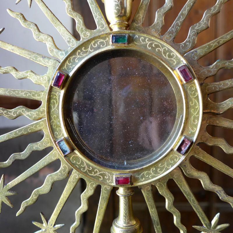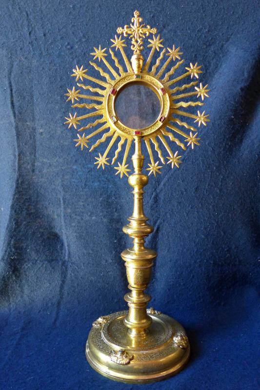 Custodia portátil o de tipo ostensorio compuesta a base de pie circular moldurado, astil abalaustrado con nudo periforme y ostensorio circular rodeado de rayos lisos y flameados que alternan. El pie porta diversos querubes de fundición aplicados sobre el cuerpo medial y el viril exhibe pedrería roja y verde en cabujones cuadrangulares. El conjunto remata en cruz griega de remates floreados sobre un basamento oval. Dada la cronología de la pieza la ornamentación de picada de lustre jugó un papel fundamental como puede verse en toda su superficie.