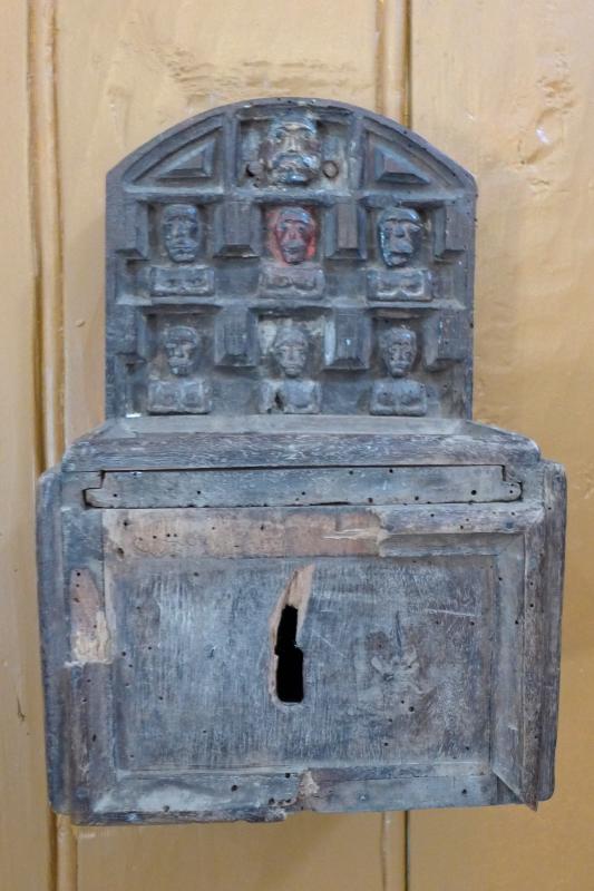 Caja prismática utilizada para recibir las limosnas de la Cofradía de Ánimas de San Esteban. Al tratarse de un recipiente puramente funcional su decoración se limita a las sencillas molduras de sus bordes. El respaldo, rematado en un arco escarzano contiene un relieve con siete bustos de rasgos sumamente abstraídos y toscos que parecen efigiar a las Ánimas.