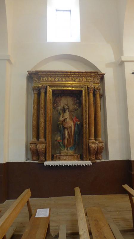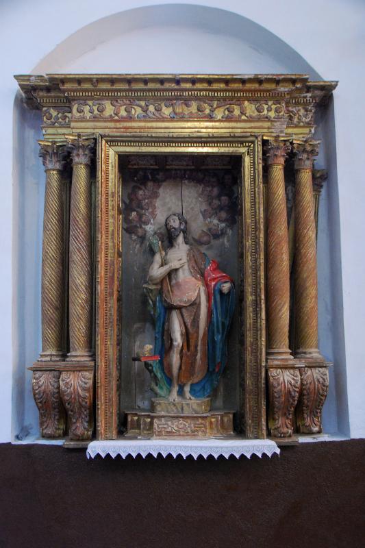 Retablo contrarreformista de clara influencia romanista. Se compone de un único cuerpo con encasamiento central de forma rectangular y dos parejas de columnas entorchadas y capiteles corintios en los extremos. Como otros de los retablos del templo parece acusar ciertas modificaciones pues carece de banco o basamento y las ménsulas sustentantes y la caja apoyan inusualmente sobre la mesa de altar. La hornacina, además, carece de cerramiento inferior, por lo que los ornatos geométricos de su marco (dentellones y gallones) aparecen sólo en tres de sus lados. Está habitada por una imagen de San Juan Bautista. El retablo carece de ático o remate, pues queda excesivamente ajustado en su actual arco de fábrica. No obstante, mantiene su entablamento, con friso de exornos vegetales y cornisa volada, muy cercanos a los vistos en el retablo del Sagrado Corazón. Este detalle resulta apreciable también en su común policromía.