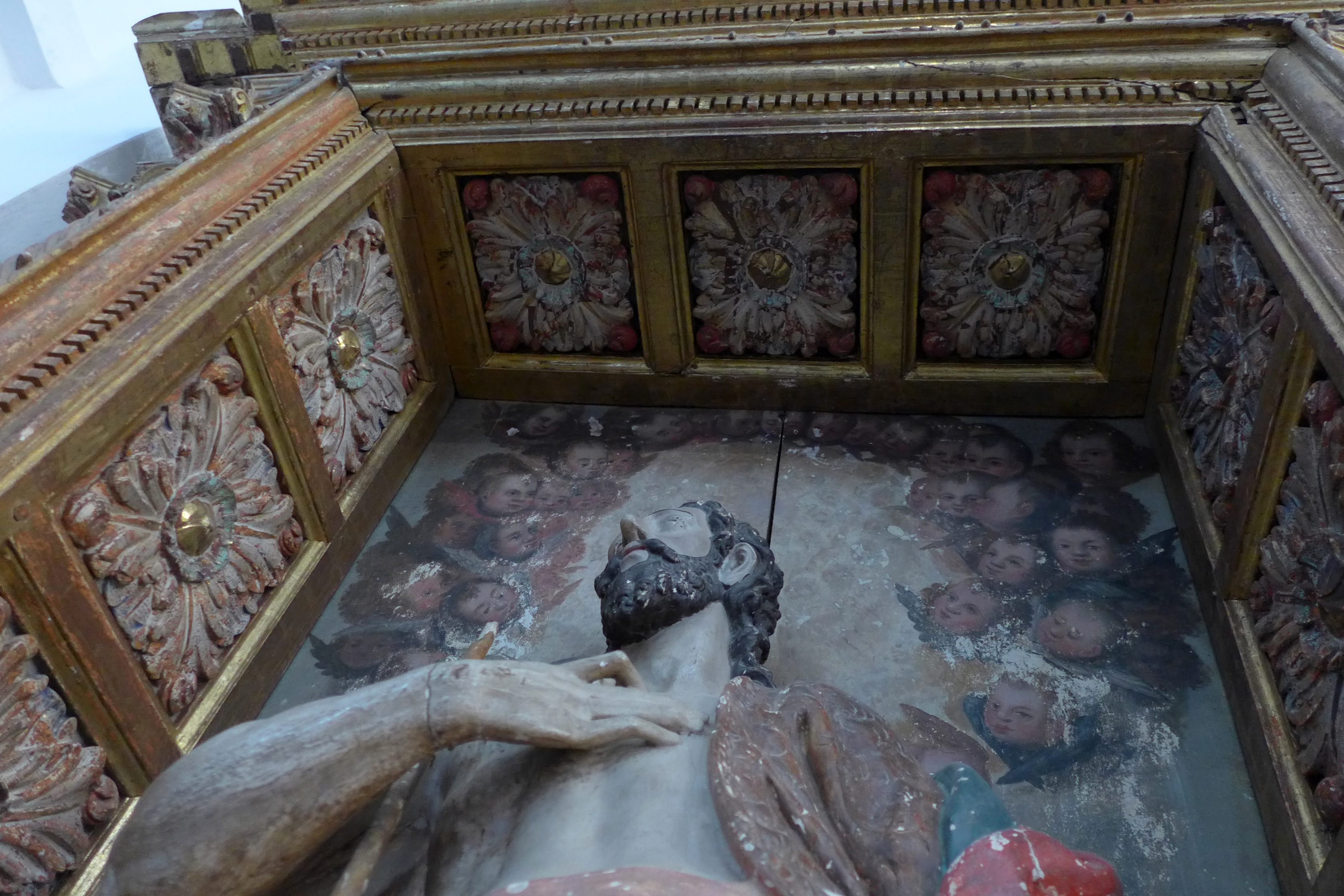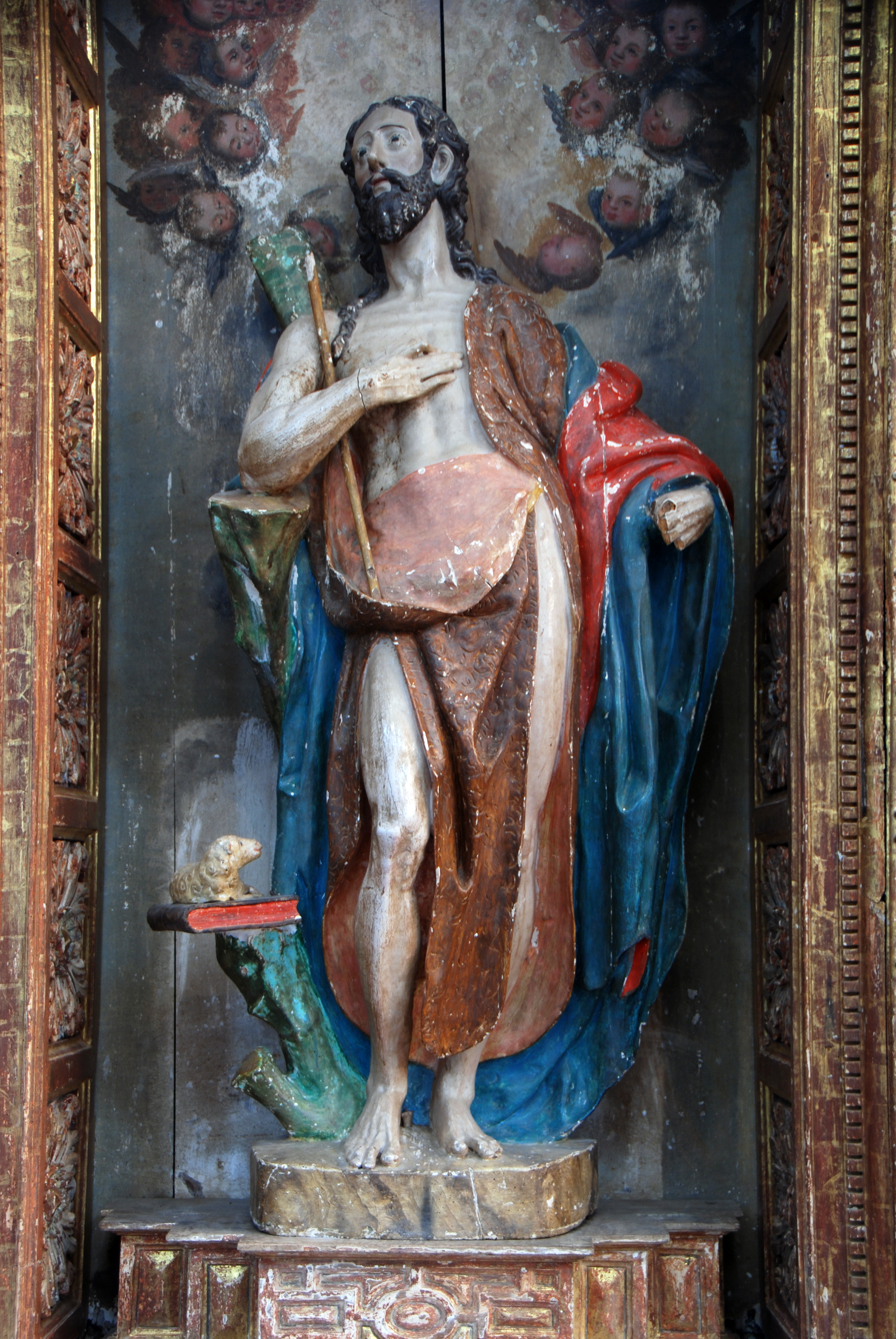 Escultura de bulto redondo del Precursor. Se nos presenta en su habitual representación de santo anacoreta, vestido con una piel de camello que le cubre parcialmente el torso, aderezada aquí con un ampuloso manto que cae desde su hombro izquierdo por detrás del cuerpo y se sujeta en una plástica brazada sobre el brazo izquierdo. La imagen adopta una pronunciada curvatura y un marcado contrapposto. Esta disposición se contrarresta con la colocación de un tronco de árbol sobre el que se poya el codo izquierdo de la figura y el libro con el Agnus Dei. Dirige la mirada a la alturas y lleva su mano diestra al pecho como aceptado la voluntad divina. Su rostro está dotado de una cierta elegancia, con barba y melena larga y ondulada, pese a que su rostro resulta un tanto inexpresivo, como suele ser habitual en la mayor parte de los maestros romanistas. Lamentablemente se encuentra bastante maltrecha, repintado y con algunas pérdidas volumétricas. Se ha pensado que esta no fuera su primitiva ubicación, dado el coro de ángeles que aparecen a la altura de su cabeza y que encajarían mejor con una imagen mariana.