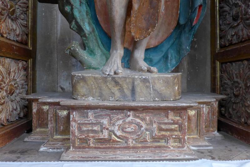 Peana de movidos perfiles y bordes modurados tanto en su parte superior como en la inferior. Tan sólo muestra decoración de talla en sus frentes, a base de composiciones de motivos geométricos, fundamentalmente rectángulos y óvalos. Conserva parte de su policromía marrón y dorada.