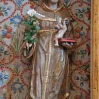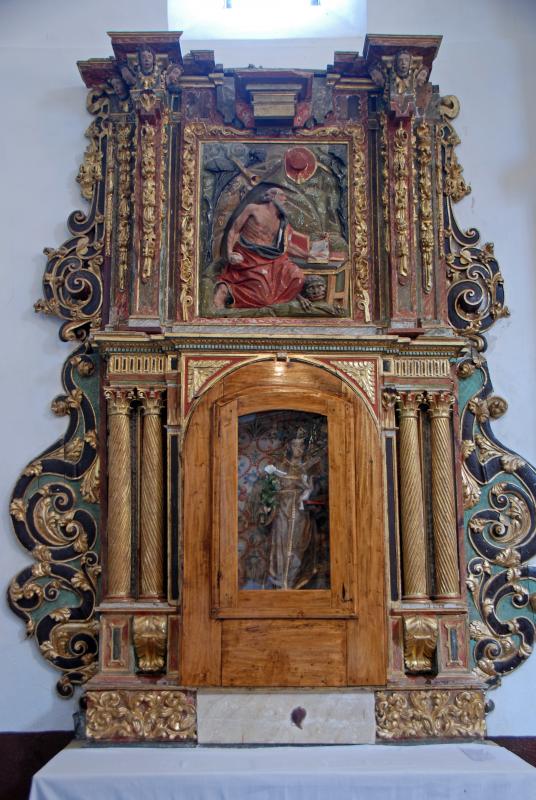 Retablo compuesto de dos cuerpos de dispar factura, el inferior contrarreformista el superior barroco, ensamblados seguramente como partes de un mismo conjunto a fines del siglo XVII. En este último momento se añadiría también el pequeño basamento con rameados vegetales de aspecto carnoso y los aletones con tornapuntas y hojas que pretender dar cierta unicidad a los dos cuerpos. El cuerpo bajo, donde va el titular del retablo consta de dos pares de columnas entorchadas, sustentadas sobre netos y ménsulas, que flanquean una hornacina central. Esta, ha perdido su forma original al modificarse y cerrarse en algún momento relativamente reciente, aunque parece que tuvo forma de arco de medio punto.