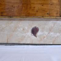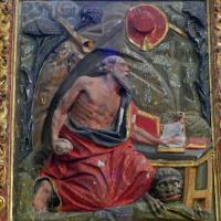 El cuerpo superior es más sencillo en arquitectura, pero riquísimo en su decoración de cáracter barroco, repartida por toda su superfice a base de aplacados, colgantes, cabezas de querubes... En él, varios pares de pilastras superpuestas, lo que provoca un notable movimiento, enmarcan el encasamiento central, donde se puede reconocer un relieve de San Jerónimo Penitente. Tal y como se configuró el conjunto, este cuerpo alto parece que quedó preparado para recibir imágenes sobre él, lo que no sabemos si en algún momento ocurrió.