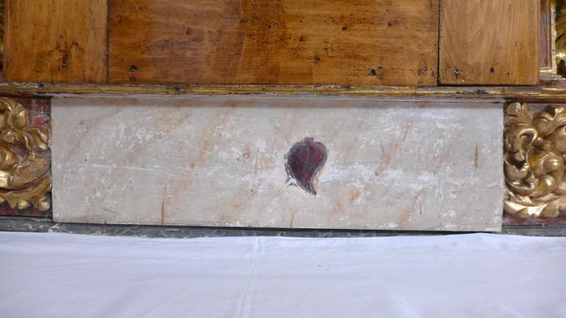 En el centro del basamento se insertó una pequeña tabla, hoy jaspeada, en cuyo centro se grabó y pintó un corazón en color rojo.