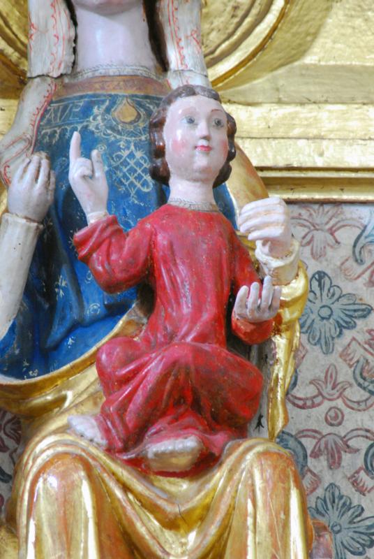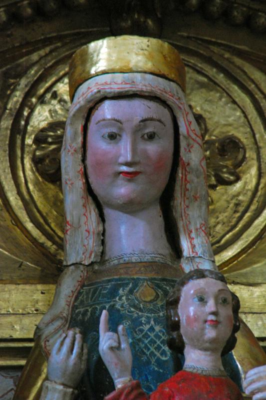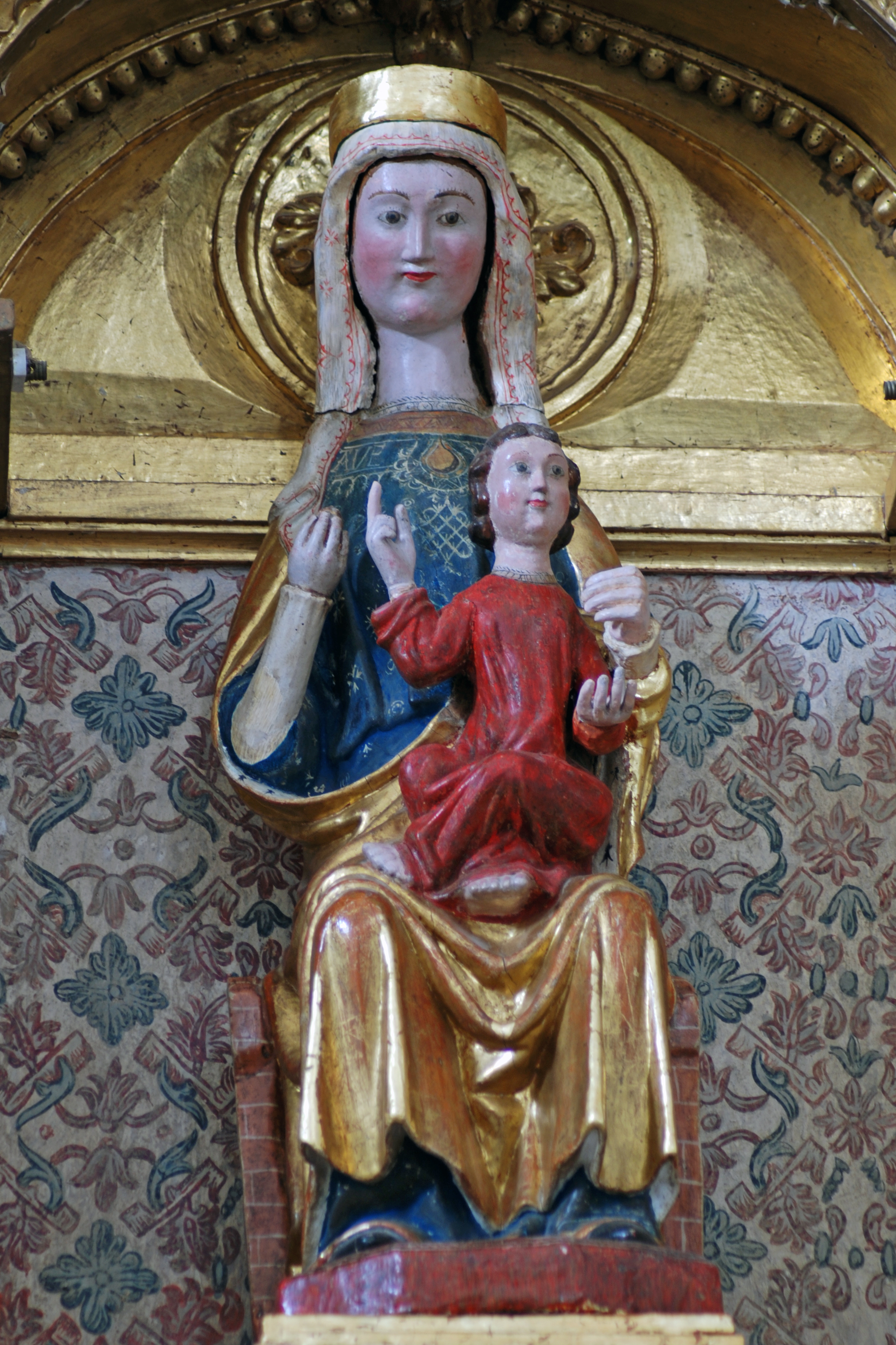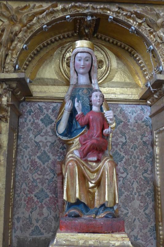 Imagen de bulto titular de la arruinada iglesia de Nuestra Señora de Folibar. Se trata de una Virgen con el Niño gótica dispuesta como tantas otras, sedente con el Niño sentado sobre su regazo y ligeramente desplazado hacia la pierna izquierda de la Madre. Ella viste túnica, manto y velo que le cae a ambos lado de la cara y sobre los hombros, Él porta únicamente una túnica lisa de color rojizo. Son varias las cuestiones que llaman la atención, la primera lo estilizado de las figuras, carácter que se agudiza con los esbeltos cuellos y alargados rostros de ambas. También, frente a la acusada frontalidad de la Virgen, incluso en la disposición de sus paños y la composición de los plegados, está la figura del Niño con un movimiento evidente en la colocación de sus piernas y en la posición de sus manos. Estos detalles, unidos a la sonrisa que esbozan ambos nos sitúa ante una cronología avanzada. Aún así mantiene ciertas rémoras de los siglos anteriores, como la formulación del sitial o la presencia de corona real (aunque modificada) en la Virgen. Su policromía, aunque bastante intervenida en su última restauración se asemejaría bastante a la original, con colores comunes a la mayor parte de estas imágenes: azul, rojo y dorado.