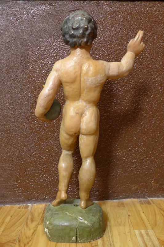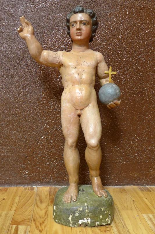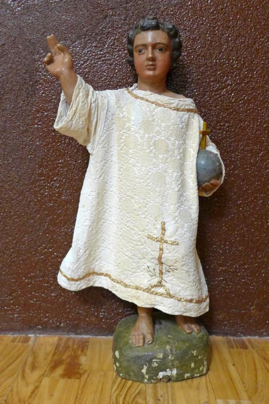 Imagen de bulto redondo del Niño Jesús ubicada actualmente sobre el basamento del retablo mayor. Aunque habitualmente se muestra vestido, su talló por completo y demostrando un estudio anatómico bastante apurado, como es propio de la estética romanista a la que pertenece. Va en pie, marcando un ligero contrapposto y alzando el brazo izquierdo para bendecir mientras en la izquierda recoge el orbe. Su cabeza gira ligeramente hacia la derecha, con un rostro bastante inexpresivo y una cabellera trabajado con amplios mechones. Conserva parte su su original policromía.