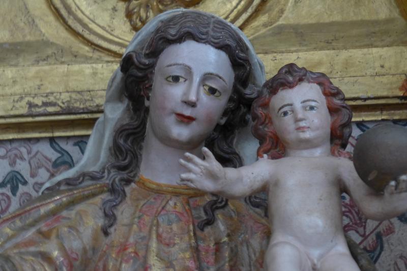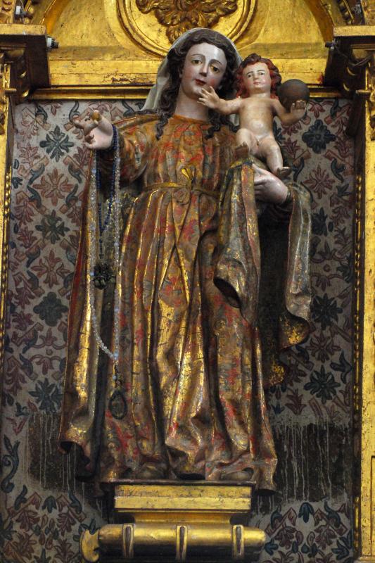 Imagen de bulto redondo de Nuestra Señora del Rosario que hermana con el resto de imágenes vistas en el retablo mayor, si se exceptúa obviamente a la Virgen de Folibar. Debió salir del mismo taller que las anteriores, pues hermana con ellas tanto en la disposición de la imagen, su movimiento, el tratamiento de los paños o el trabajo de las manos y los rostros. Abunda esta en el estofado de la túnica que viste, profusamente elaborado. Los alatonados pliegues se hace patente donde los vuelos son mayores, como en el resto del manto que sujeta con la mano izquierda y sobre el que se asienta el Niño. La Virgen va en pie, con un ligero alabeo hacia el lado izquierdo y muestra un fruto u objeto irreconocible en su mano izquierda. Su cabeza recibió una correcta talla, con facciones finas y bien definidas, melena larga y mechones ondulantes que cae sobre el pecho y se ocultan parcialmente mediante un velo blanco.