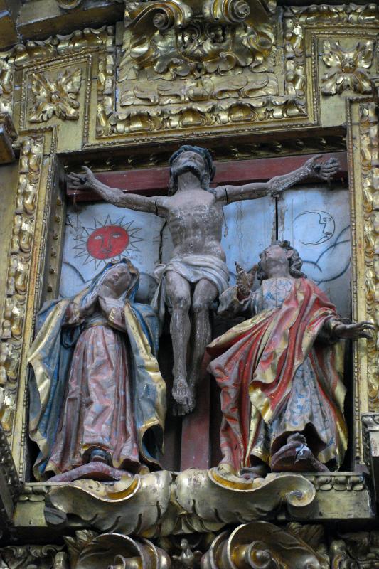 Calvario de bulto redondo compuesto de tres imágenes: Cristo crucificado, San Juan Evangelista y la Virgen Dolorosa. Ocupa la hornacina central del ático, insertándose en un encasamiento rectangular.