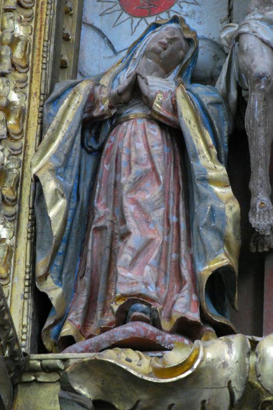 Imagen de bulto redondo representando a la Virgen Dolorosa y que forma parte del Calvario que se dispone en el ático del retablo mayor. Como su pendant, es imagen barroca de notable valía, aunque algo más estática que la anterior. La Virgen se coloca en pie, de manera frontal, con las manos unidas en oración y vestida con túnica ceñida y manto que le cubre hasta la cabeza y que se reparten de manera bastante equilibrada y simétrica a ambos costados de la figura. Tan sólo rompe esta frontalidad la cabeza de la Virgen, en una postura forzada que se ladea hacia Cristo. Dirige su mirada hacia lo alto, buscando consuelo en su Hijo. Los alatonados pliegues de sus vestiduras van iluminados en tonos rojizos, blancos y azules, con la persistente presencia del dorado tanto para las estofaduras como para los ribetes del manto, mangas de la túnica o el ceñidor.