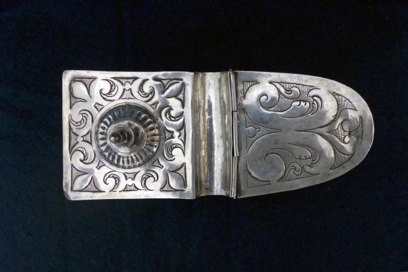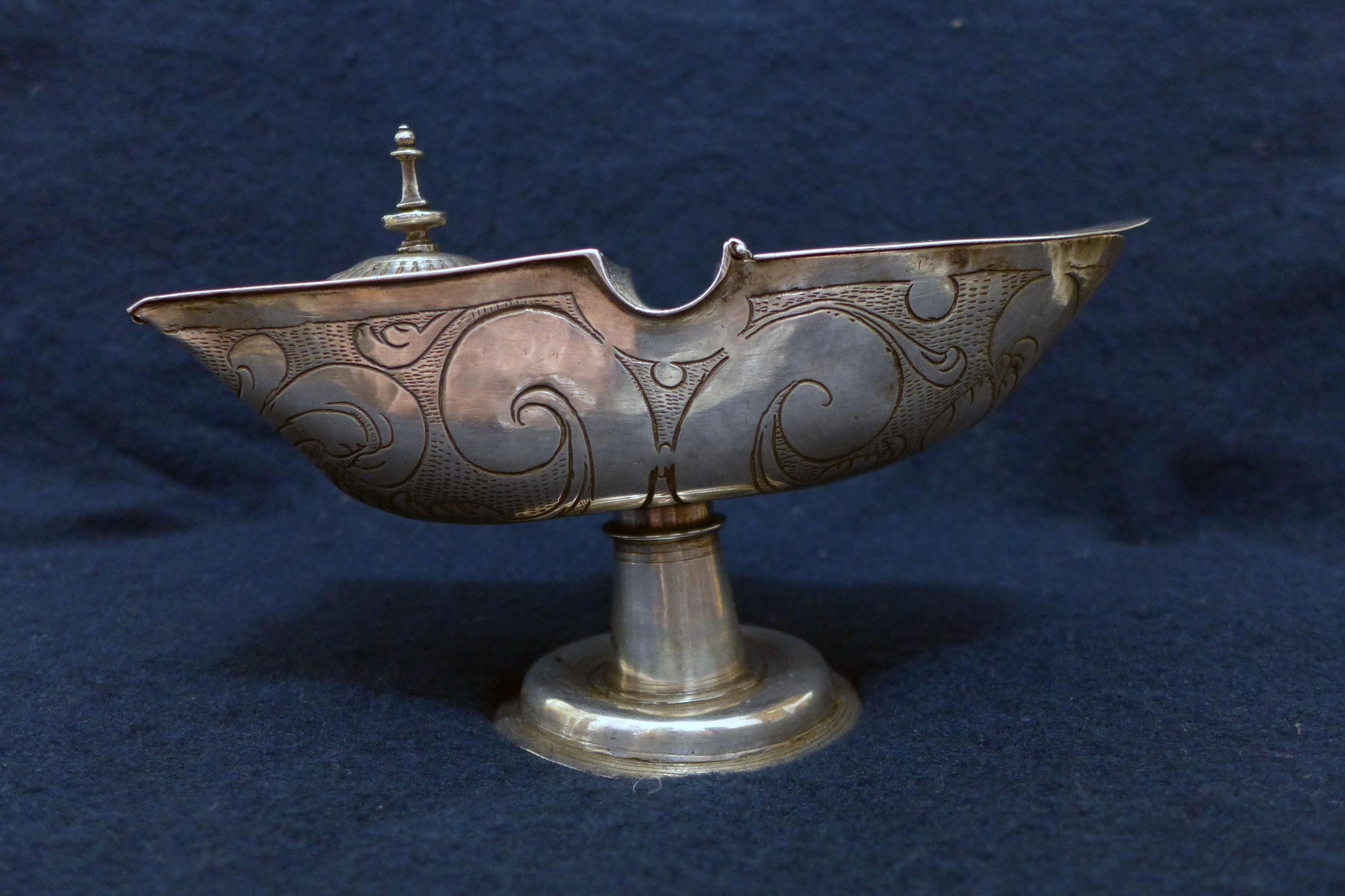 Recipiente para contener el incienso usado en las celebraciones litúrgicas. Consta de pie moldurado con pestaña saliente y vástago cilíndrico. La nave propiamente dicha tiene forma semioval con proa y popa separadas por una amplia escotadura. La proa tiene una tapadera abatible, mientras la popa exhibe en su perillón fundido de remate. La superficie de la nave se decora con "ces" y motivos vegetales sobre un fondo de picado de lustre.