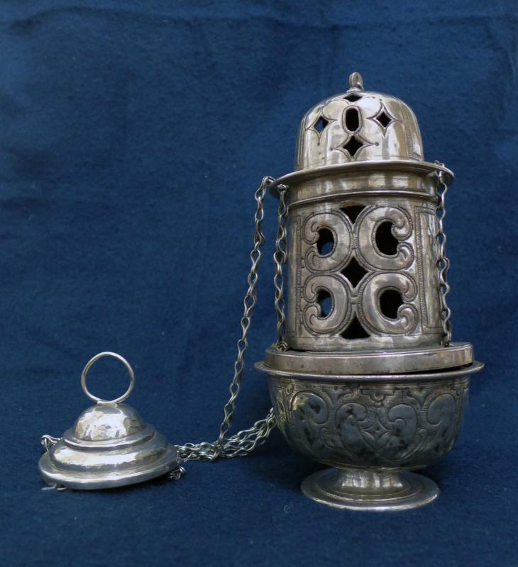 Incensario compuesto de casca con estrecho pie moldurado y recipiente convexo con pestaña saliente. El turíbulo o cuerpo de humo adopta forma cilíndrica y se cierra con un caso cupular. Tres cadenas unen el incensario con el manípulo. Este último es liso y abullonado. Respecto a sus motivos ornamentales se reducen básicamente a elementos geométricos y "ces" arriñonadas. Todos estos detalles van, además, calados en el cuerpo de humo.