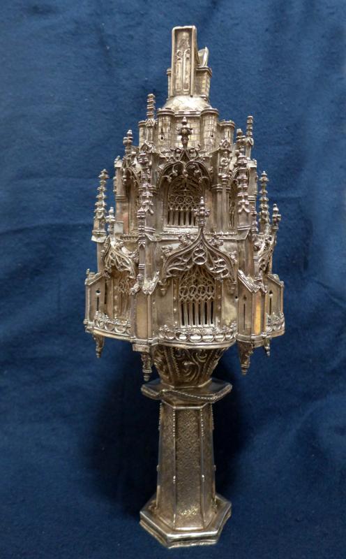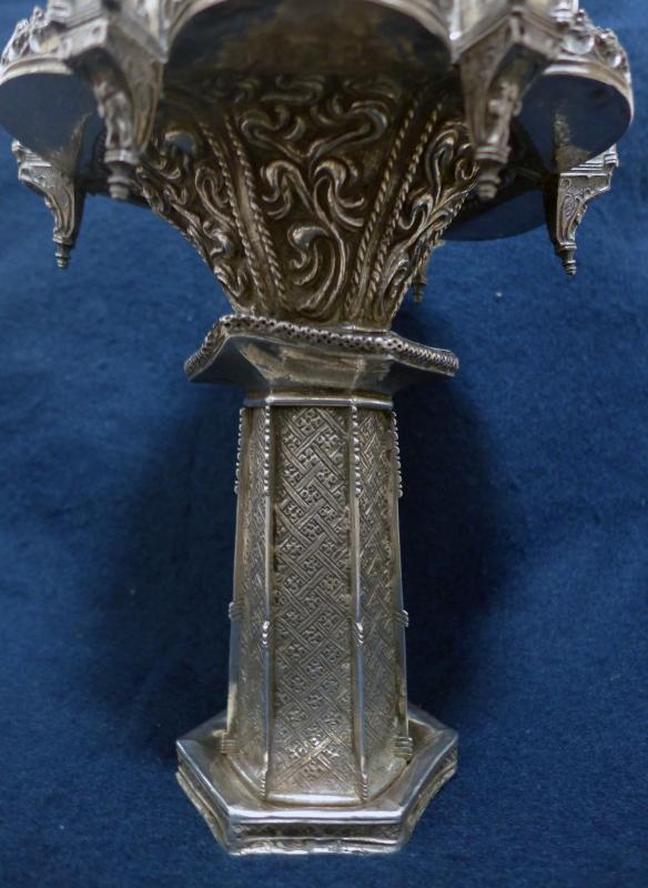 El brazo inferior de la cruz anterior está preparado para insertarse en una macolla. Esta, por suerte, se conserva, aunque desmontada para su almacenamiento. Corresponde a las conocidas como de tipo castillete dada su compleja arquitectura gótica. Se compone de tres cuerpos superpuestos y de tamaño decreciente. Los dos primeros contienen ventanales góticos rematados por tracerías y arbotantes con pinaculillos. El superior adquiere forma lobulada y en su superficie se grabaron una especie de sillares simulando una arquitectura fortificada incluso con sus aspilleras. La parte inferior de la macolla, donde se enmanga el varal, es mucho más sencilla, con un sencillo cañón de extremos salientes y una corola de gallones con motivos de hojarasca en la que apoya toda la arquitectura.