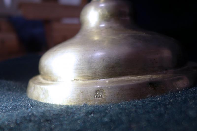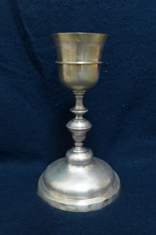 Cáliz de base abullonada y alto borde moldurado. Su astil se reduce a un nudo periforme invertido y a un cuello de perfil troncocónico. La copa es lisa, acampada y de labios abiertos, con una pestaña saliente hacia la mitad.