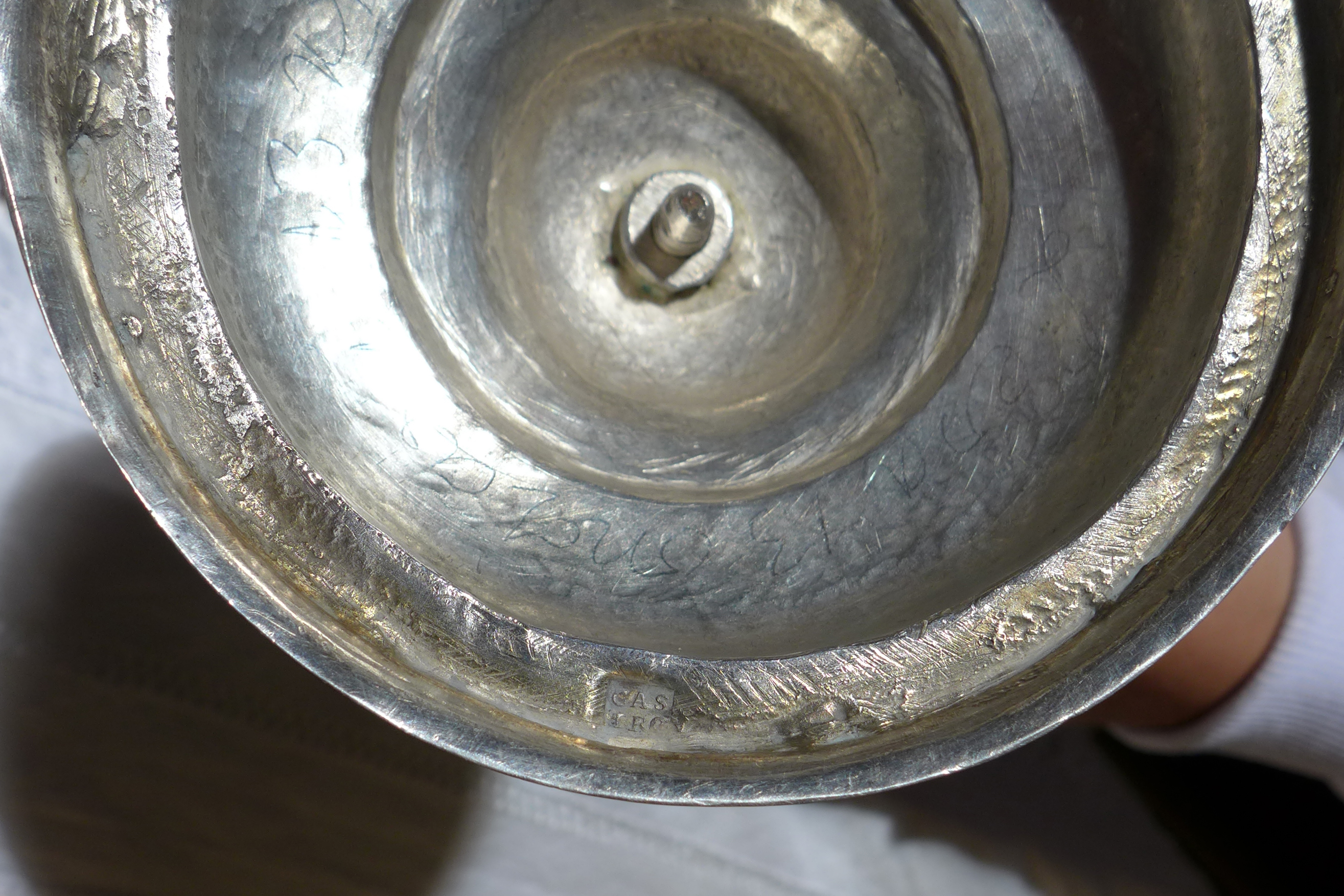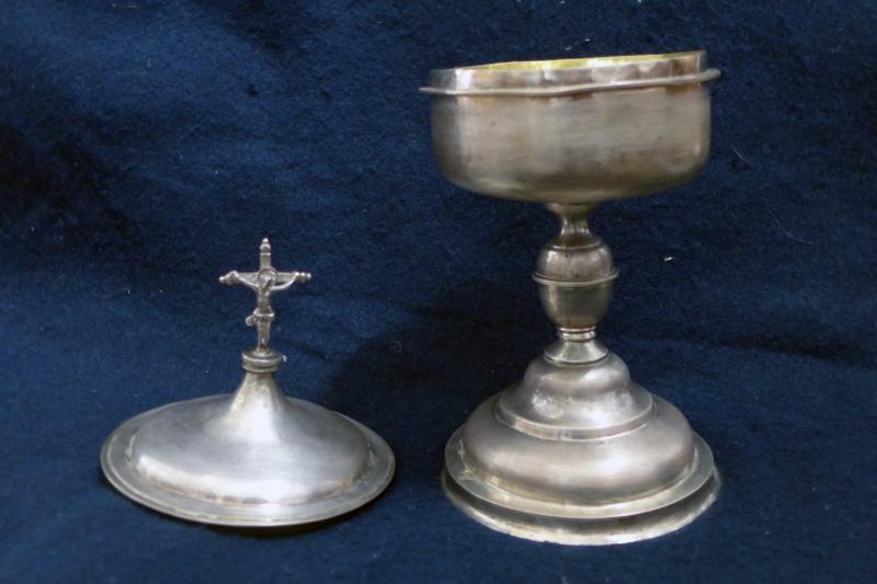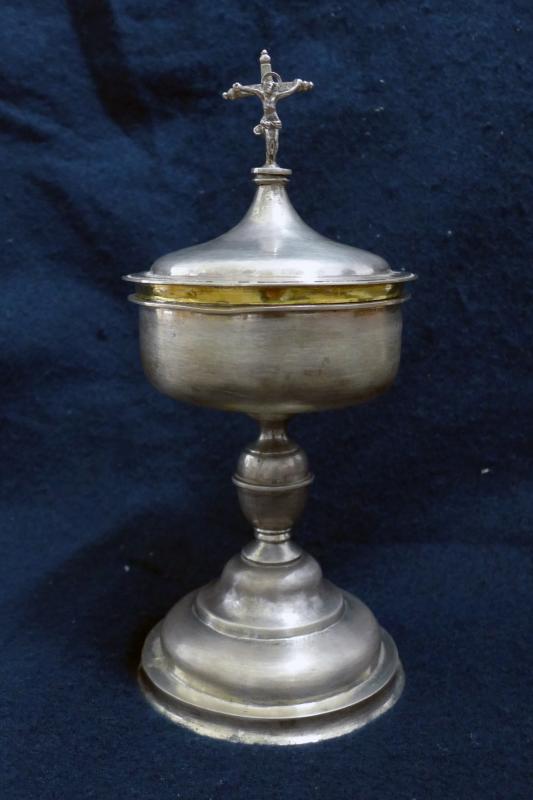 Copón de pie abullonado con pestaña saliente, astil de nudo ovoidal y copa cilíndrica con moldura superior para encajar la tapadera. Esta última adquiere un perfil conopial y se remata con un crucificado de fundición. A excepción de esta pieza predomina la labor de relevado y torneado. Aunque la pieza es de plata en su color, en la unión del vaso con la tapa se vislumbra un borde sobredorado.