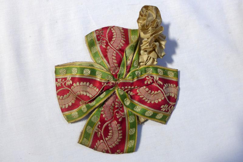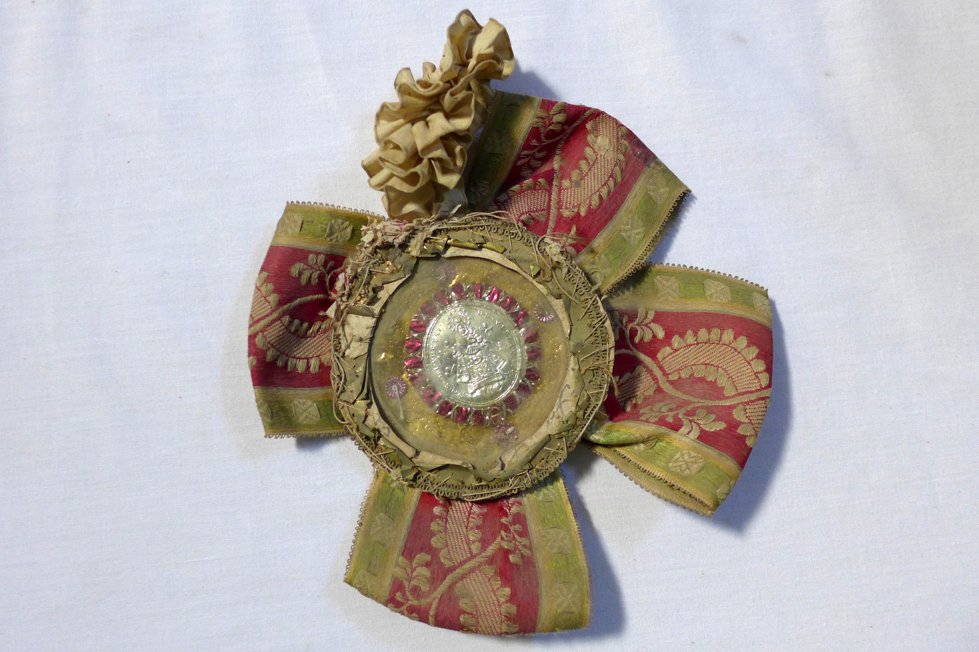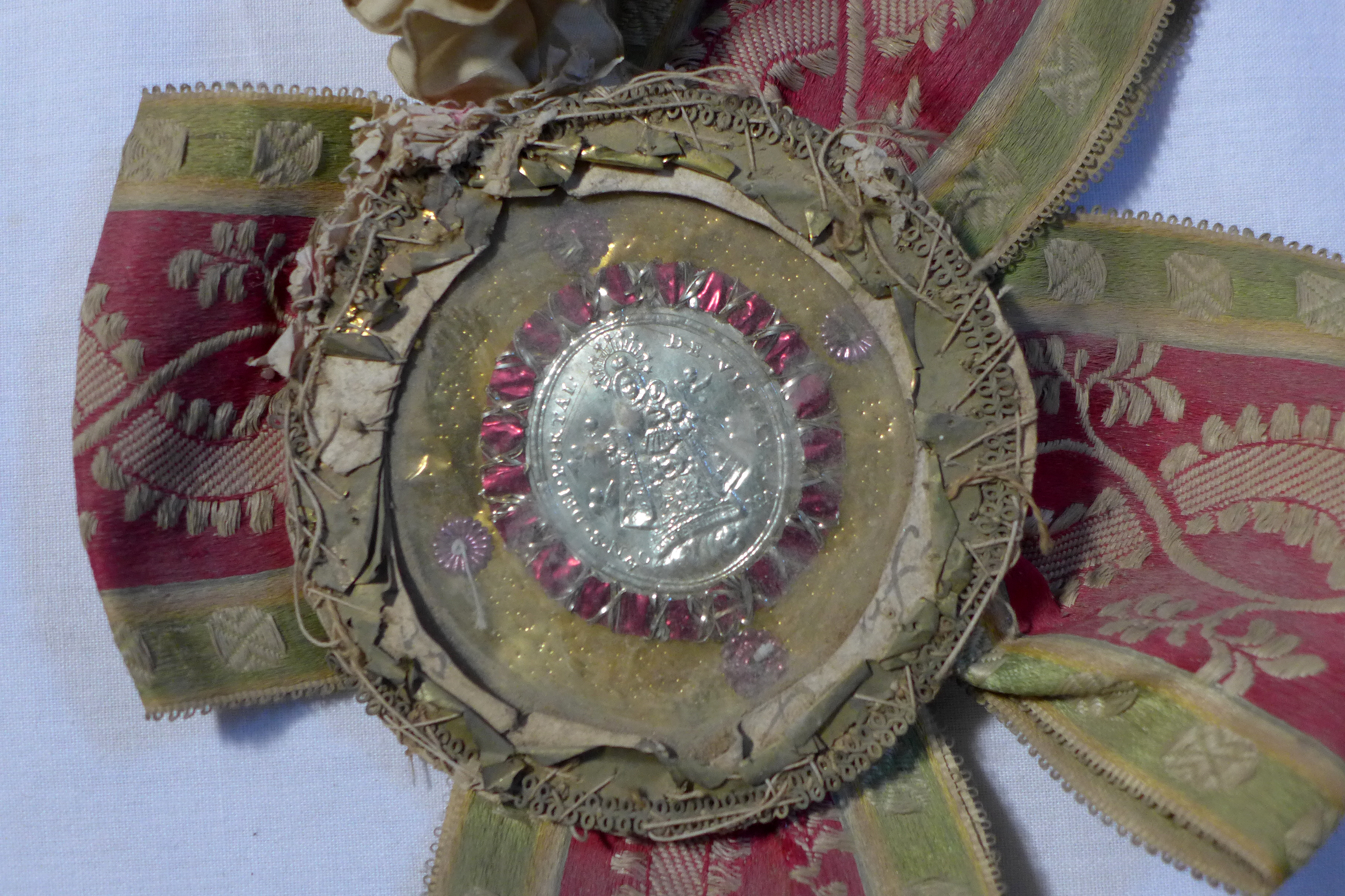 Medalla textil o colgante en forma de lazo. Su parte central, circular, contiene una metalla metálica de Nuestra Señora del Portal de Villaba, advocación romana. El resto de la pieza se elaboró en textil adamascado, hijo metálico y galón.