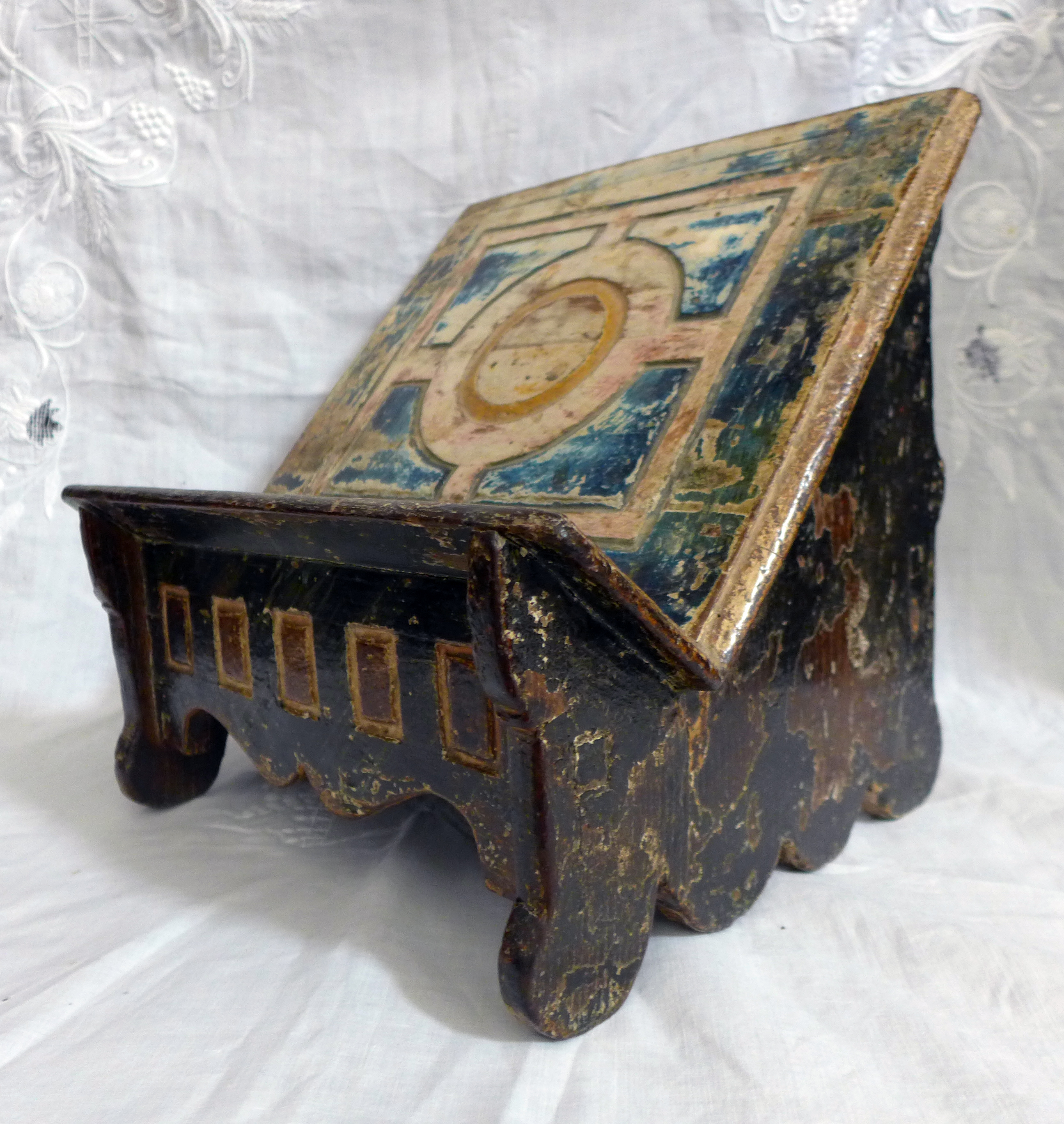 Entre el mobiliario y los elementos de ajuar que se disponían sobre el altar mayor, solía encontrarse un atril sobre el que disponer el misal u otros libros de uso litúrgico. La mayor parte de las veces son muebles sencillos y funcionales, pero en este caso está bastante elaborado en su talla. Sus patas exhiben remates lobulados, el frente recoge una hilera de cuadrados y un remate tornapunteado y el tablero sobre el que asienta el libro muestra una composición de motivos geométricos. Aunque de factura popular está bien resuelto, lástima que su policromía esté tan deteriorada.