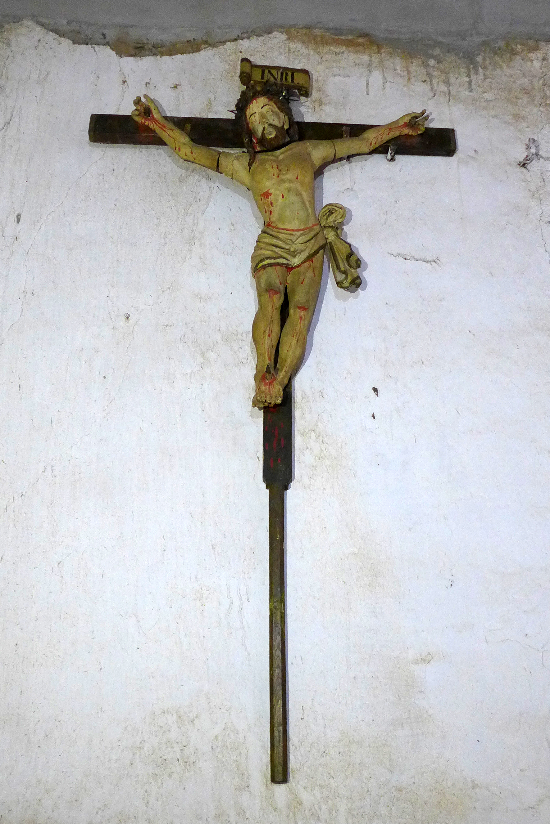 Cristo crucificado de bulto redondo y hechura bastante popular. Por la tipología de su cruz parece que pudo ser utilizado en algún momento como cruz-guión. Muestra una disposición bastante movida con un balanceo de los brazos muy acusado y un claro arqueamiento del cuerpo. Su estudio anatómico resulto poco natural, y su paño de pureza de plegados menudos se ata bajo la cadera izquierda. Parece haberse repintado en su totalidad y de manera relativamente reciente.