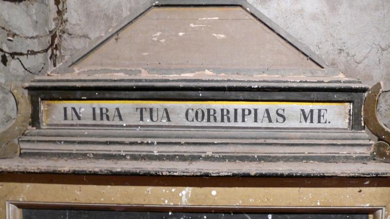 Inscripción: NE INFURORE TUO ARGUAS ME / NEQUE / IN IRA TUA CORRIPIAS ME. / DOMINE ("Señor, ni me acuses en tu furor ni me arrebates en tu ira").