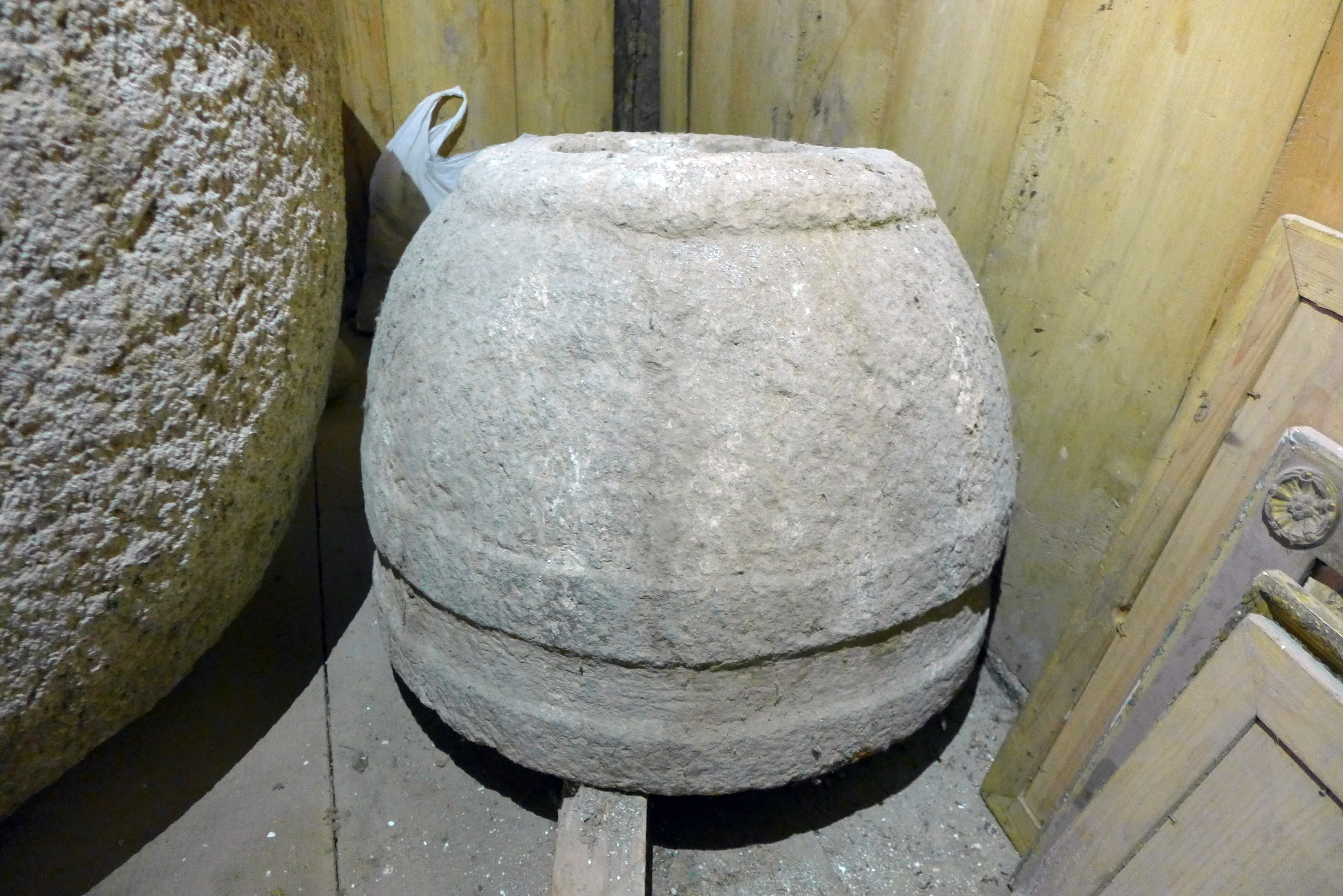 Está arrumbada en el coro bajo y dispuesta boca abajo. Pese a su menor tamaño en la parroquia es considerada como pila bautismal