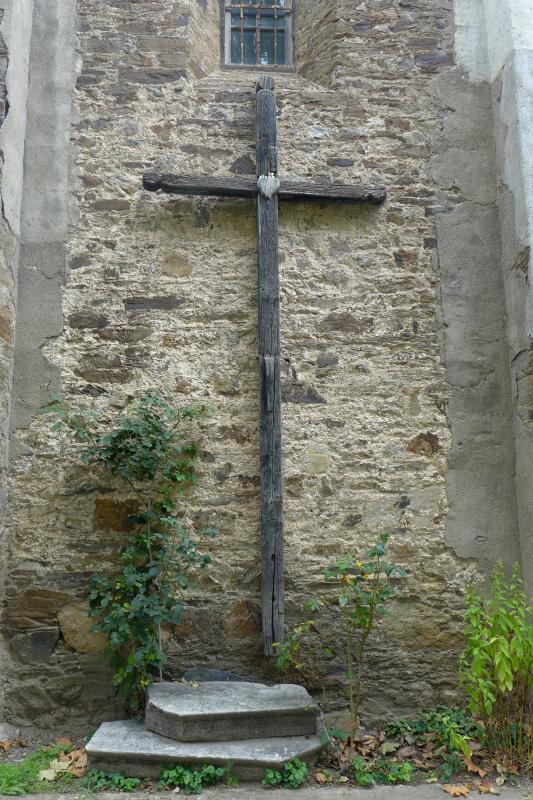 Cruz de madera de gran tamaño dispuesta en el exterior de la iglesia, elaborada en dos únicas piezas. Sus brazos se rematan en formas globulares. Y, aplicados sobre árbol se conserva el subpedáneo y un corazón, este último en la unión con el travesaño. Hacia el remate inferior se aprecian dos agujeros que desconocemos a qué pertenecen.