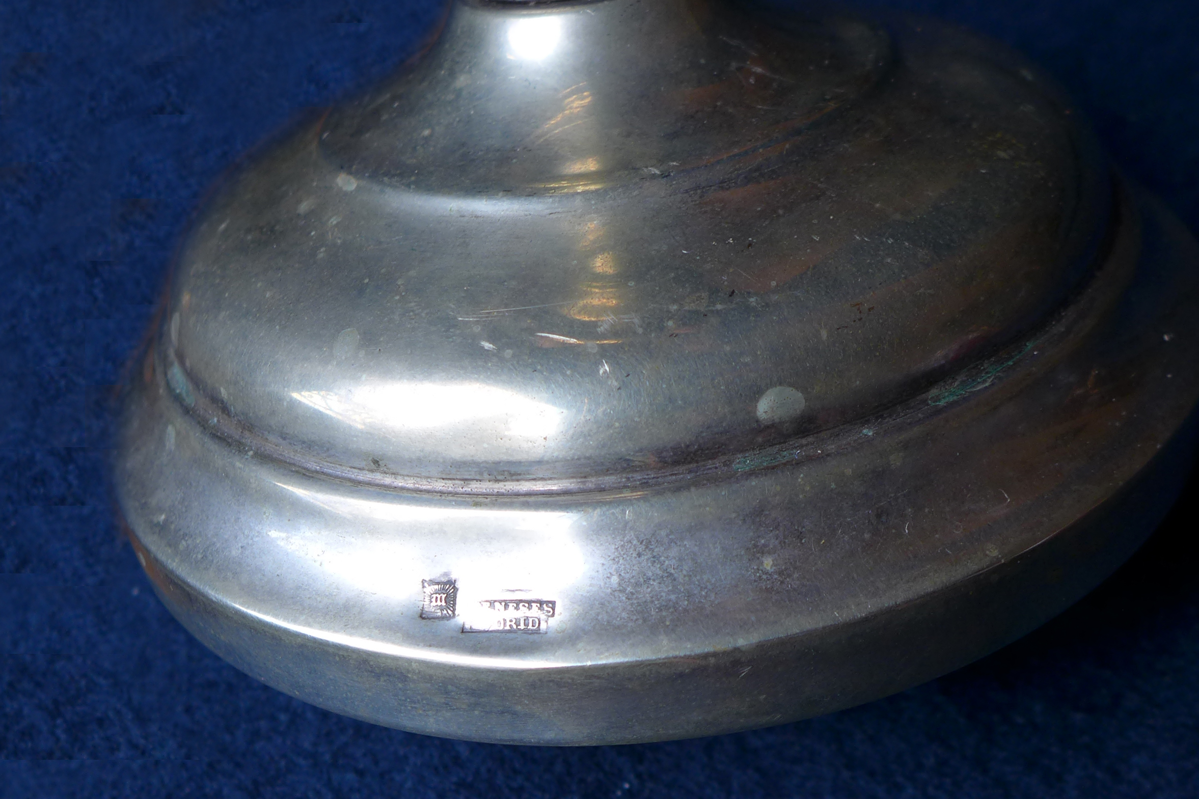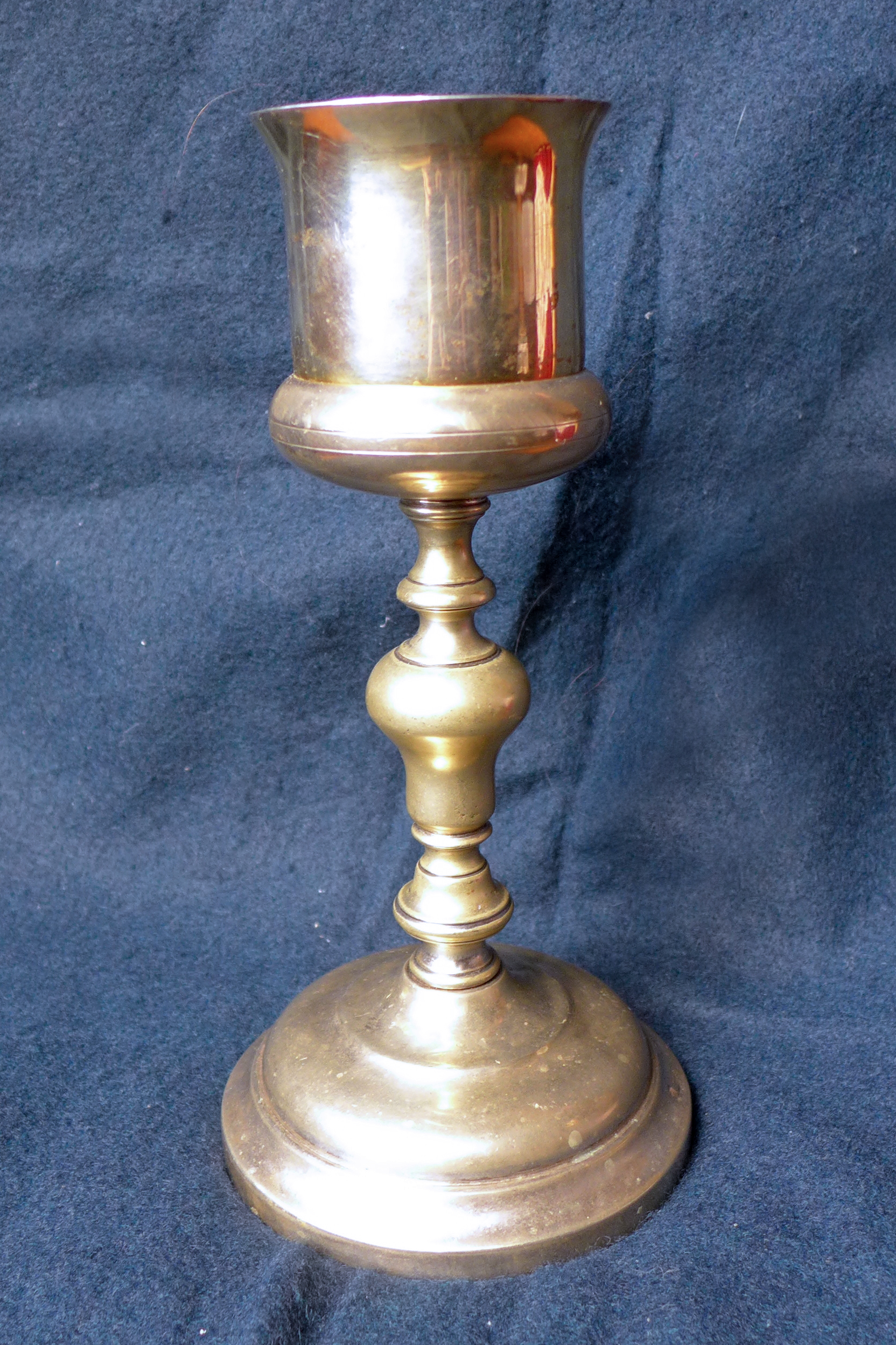 Cáliz de pie abullonado y moldurado. Su astil, torneado, se compone de distintas piezas cóncavo convexas y un nudo periforme invertido. La copa, cilíndrica, tiene rosa destacada y labios abiertos. Se trata de una pieza de factura bastante industrial, prueba de ello es que salió de los talleres madrileños de Meneses.