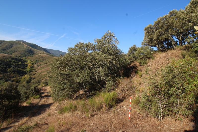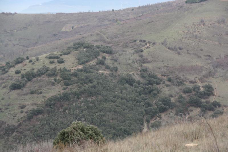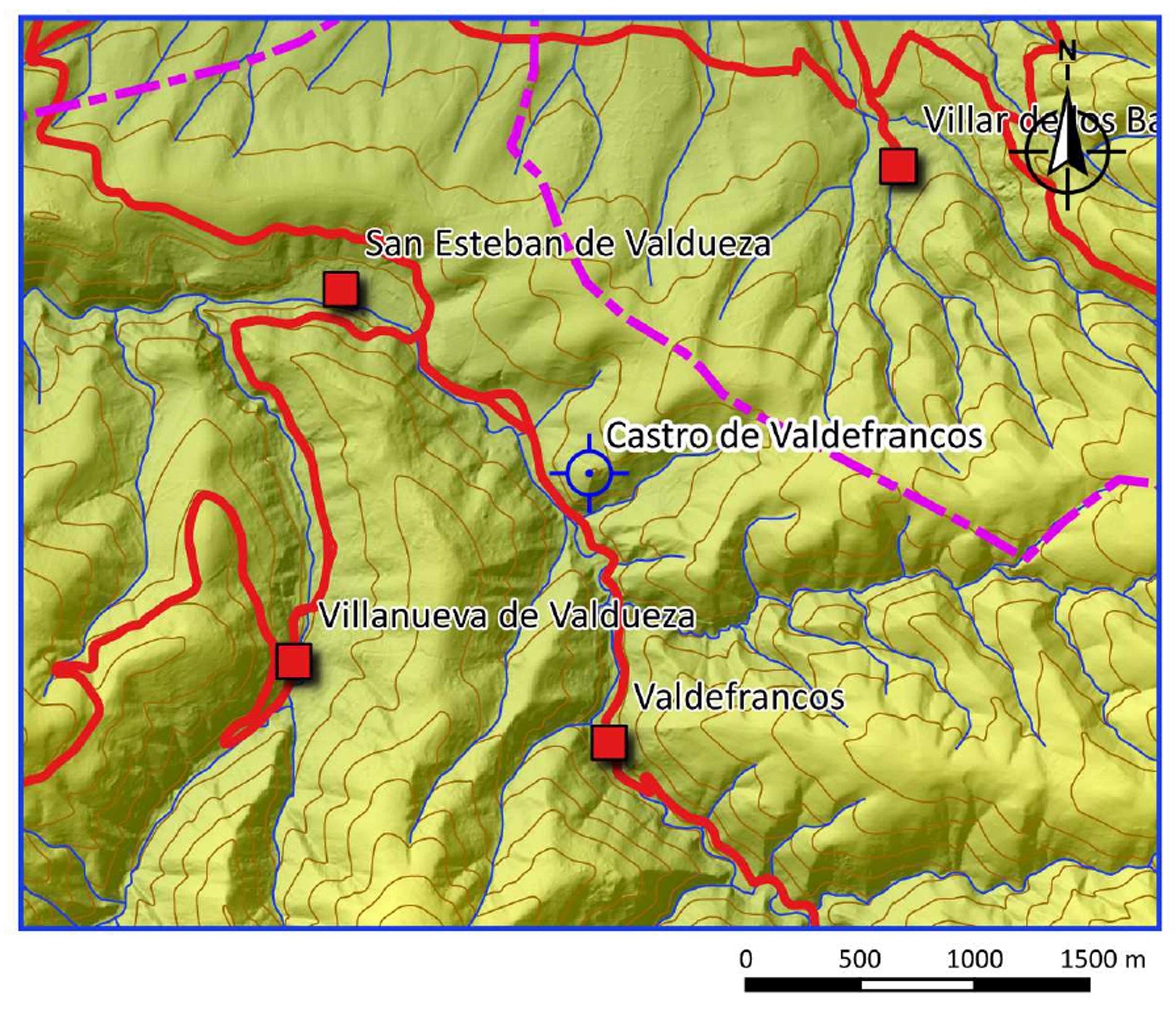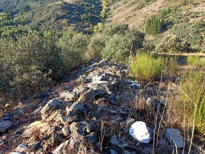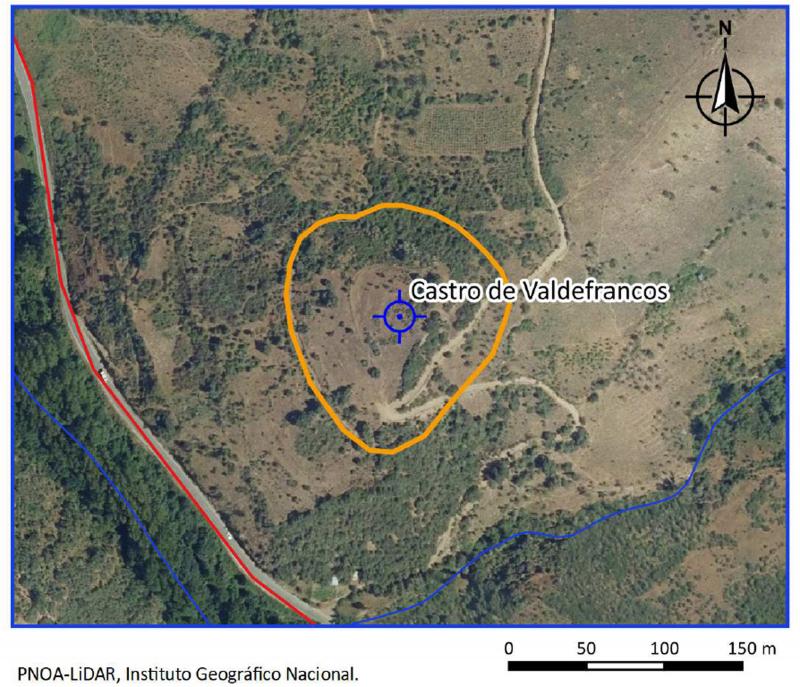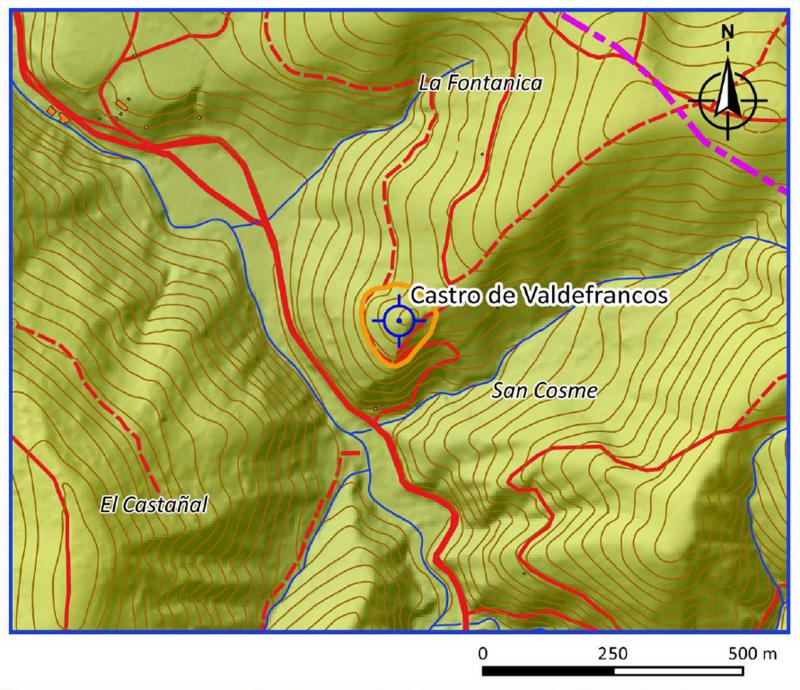 Asentamiento tipo castro en ladera que presenta una planta redondeada.