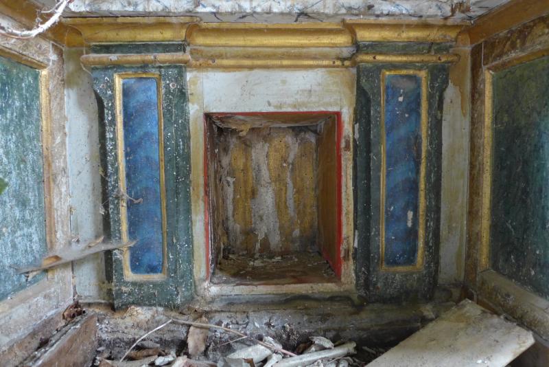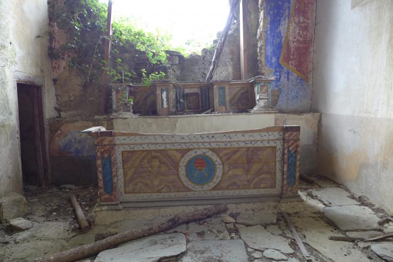 Panorama menos halagüeño encontramos al dirigir la mirada hacia el retablo mayor, más vandalizado y desmembrado que el lateral que acabamos de ver. Ambos pudieron ser coetáneos, a juzgar por lo poco que queda de ellos. El mayor se conserva parte de su frontal de altar, jalonado con pilastras cajeadas con perfiles recortados, pintado con labores jaspeadas y con un emblema alusivo a San Pedro (titular de la iglesia) en el centro. Tras esta pieza y sobre un basamento de fábrica se mantiene únicamente el banco del retablo con cuatro netos salientes que servirían de apoyo a otras tantas columnas. Estos y las piezas rehundidas contra el fondo son lisas y con cajeados rectangulares. En el centro de este frente iba el sagrario, cuyo receptáculo se mantiene pero ya sin puerta. Todo ello muestra labores marmoleadas de distintos colores, imperando los verdes y los marrones