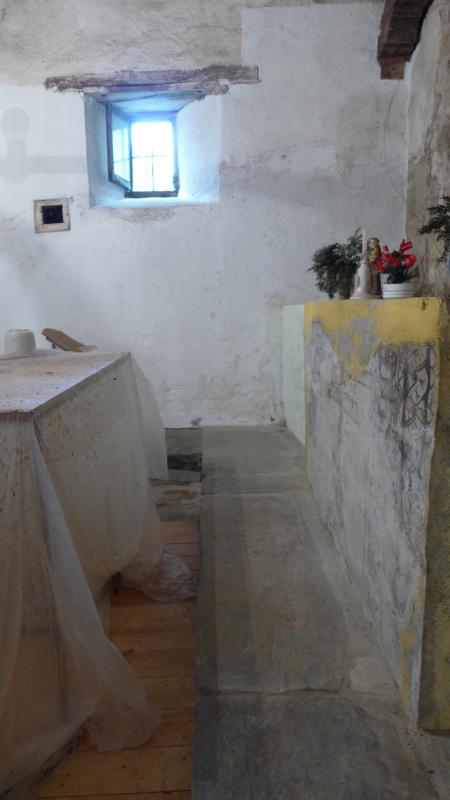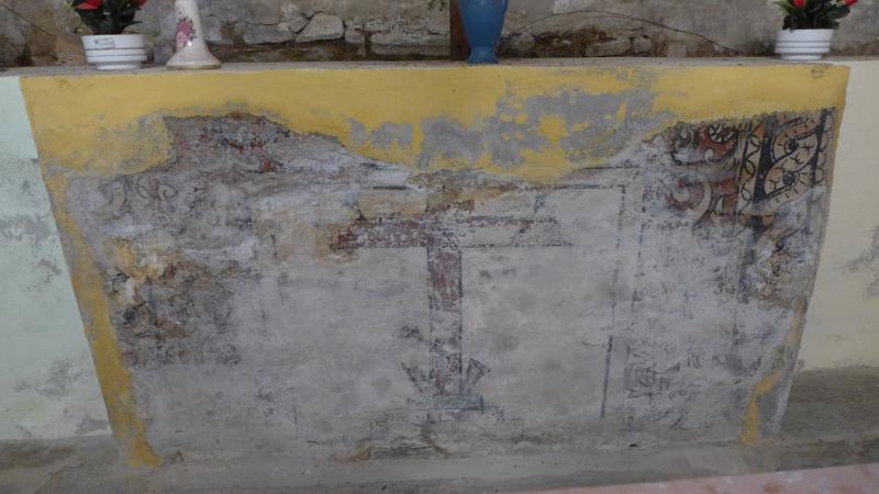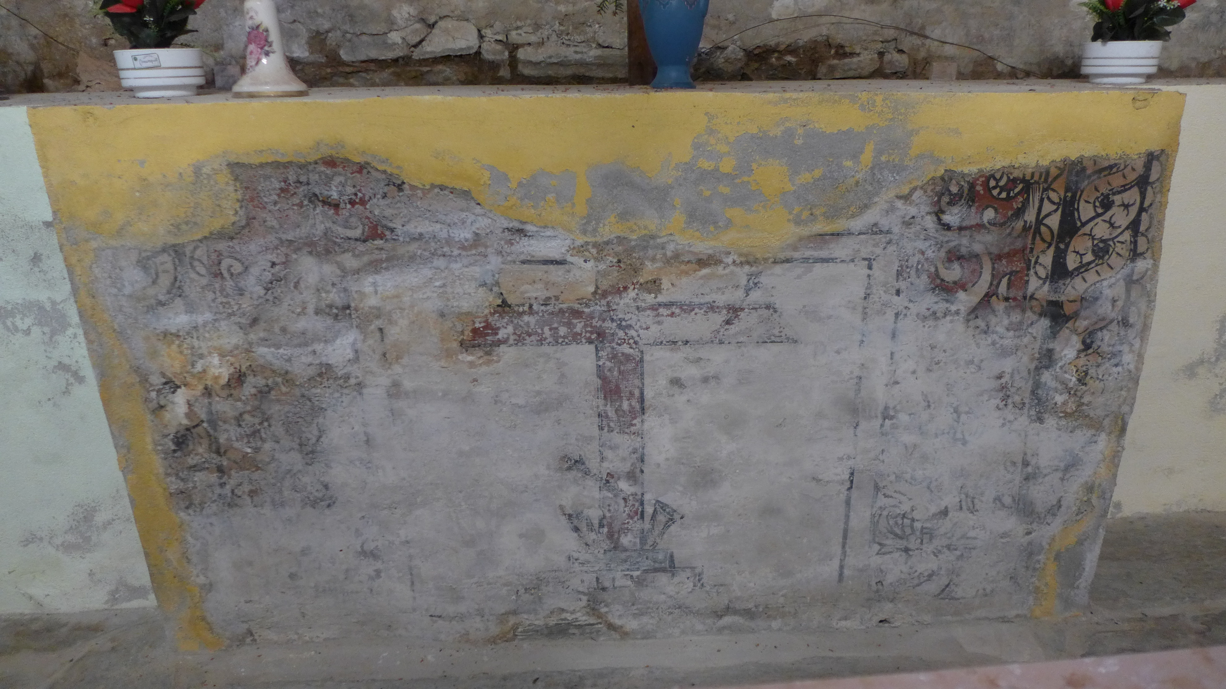 Panel de formato rectangular parcialmente conservado y en el que se aprecian varios estratos polícromos superpuestos. El original obedece a una serie de cenefas ornadas con cadenetas, ondas y grutescos que rodean por tres de su lados un plafón central cuadrangular. En él, tras un marco liso de esquinas biseladas, emerge una cruz sobre el Calvario. Todo la composición juega con tonos negros para los contornos y con marrones y blancos para rellenar cada una de sus partes.