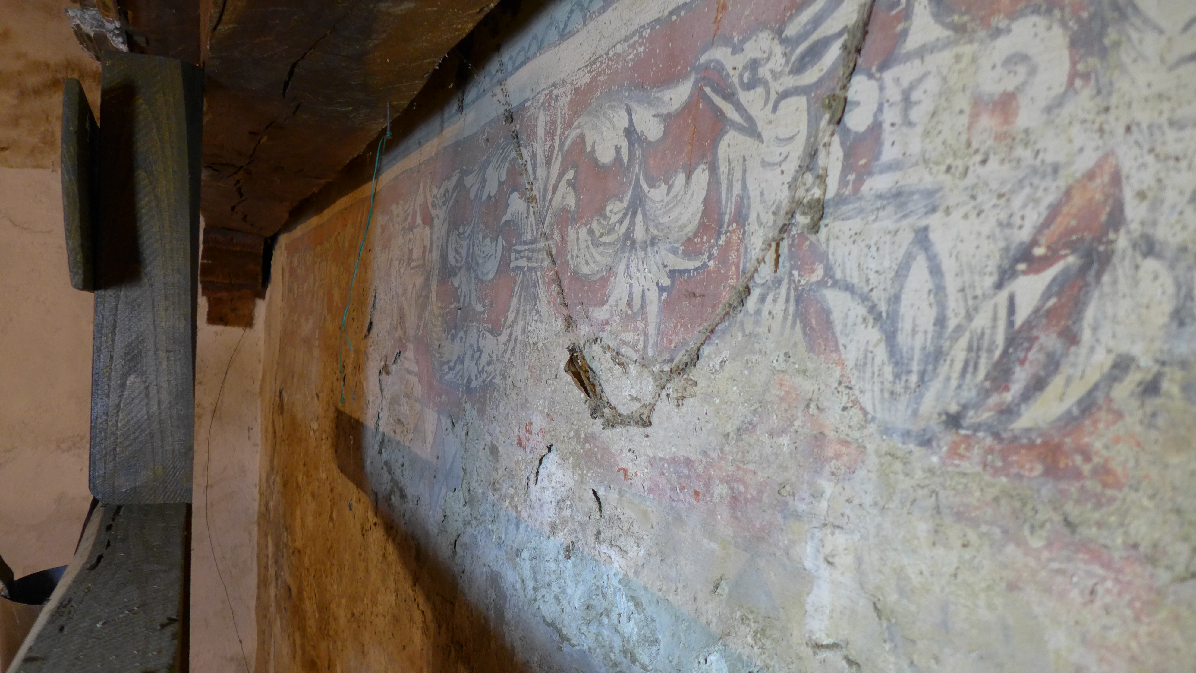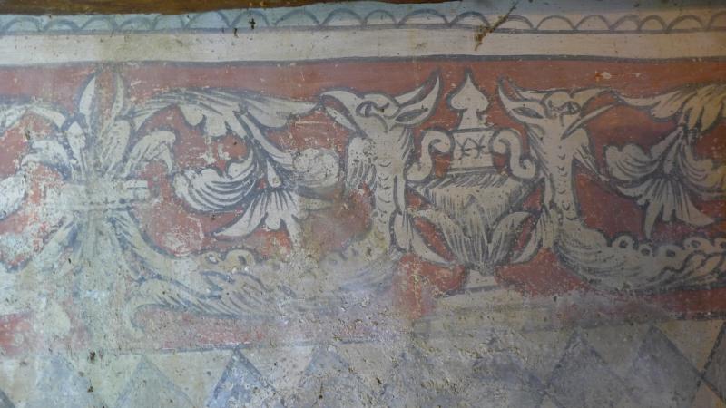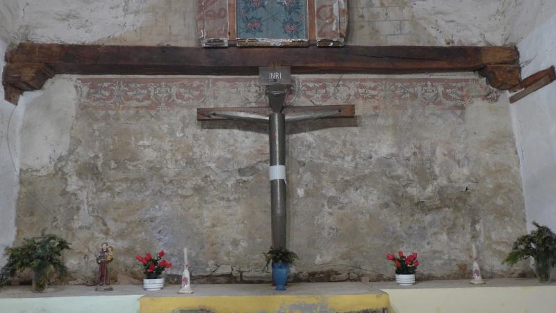 Lo poco que se conserva de este conjunto mural conecta directamente con la pintura del frontal de altar y nos recuerda a otras vistas en las iglesias del valle, caso de Compludo. De esta gran pieza rectangular, apaisada, apenas resta el tercio superior donde reconocemos dos cenefas bien delimitadas. La inferior se compone a base de rombos grises sobre fondo blanco. Sobre ella corre una greca de motivos a candelieri, a base de vegetales, seres fantásticos unidos por sus colas y jarrones. Esta especie de marco debió de continuar también verticalmente, pero casi nada queda de ello, como tampoco se sabe si en el centro del paño se pintó algún tipo de escena figurada.