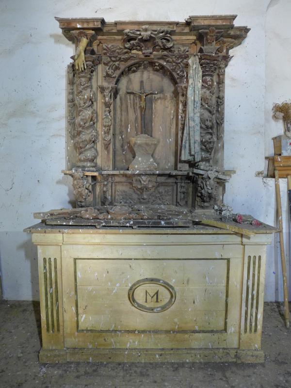 Retablo hornacina, en su color, que consta de banco, un cuerpo y ático (actualmente caído, remataba con frontón triangular y tarja central). Está flanqueado por dos columnas salomónicas apoyadas en las correspondientes ménsulas y rematadas por capiteles corintos. El arco de medio punto de la hornacina contiene en su intradós casetones con bulbos a modo de pinjantes.