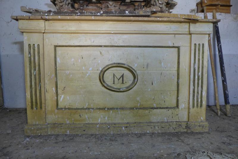 Pieza de madera compuesta de tablones unidos mediante listones por su parte posterior, no visibles. Entre dos pilastrillas laterales estriadas acoge el tablero central, moldurado, en que destaca una moldura óvalada central a modo de clípeo donde se representa una letra M.