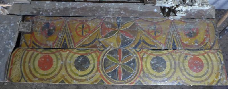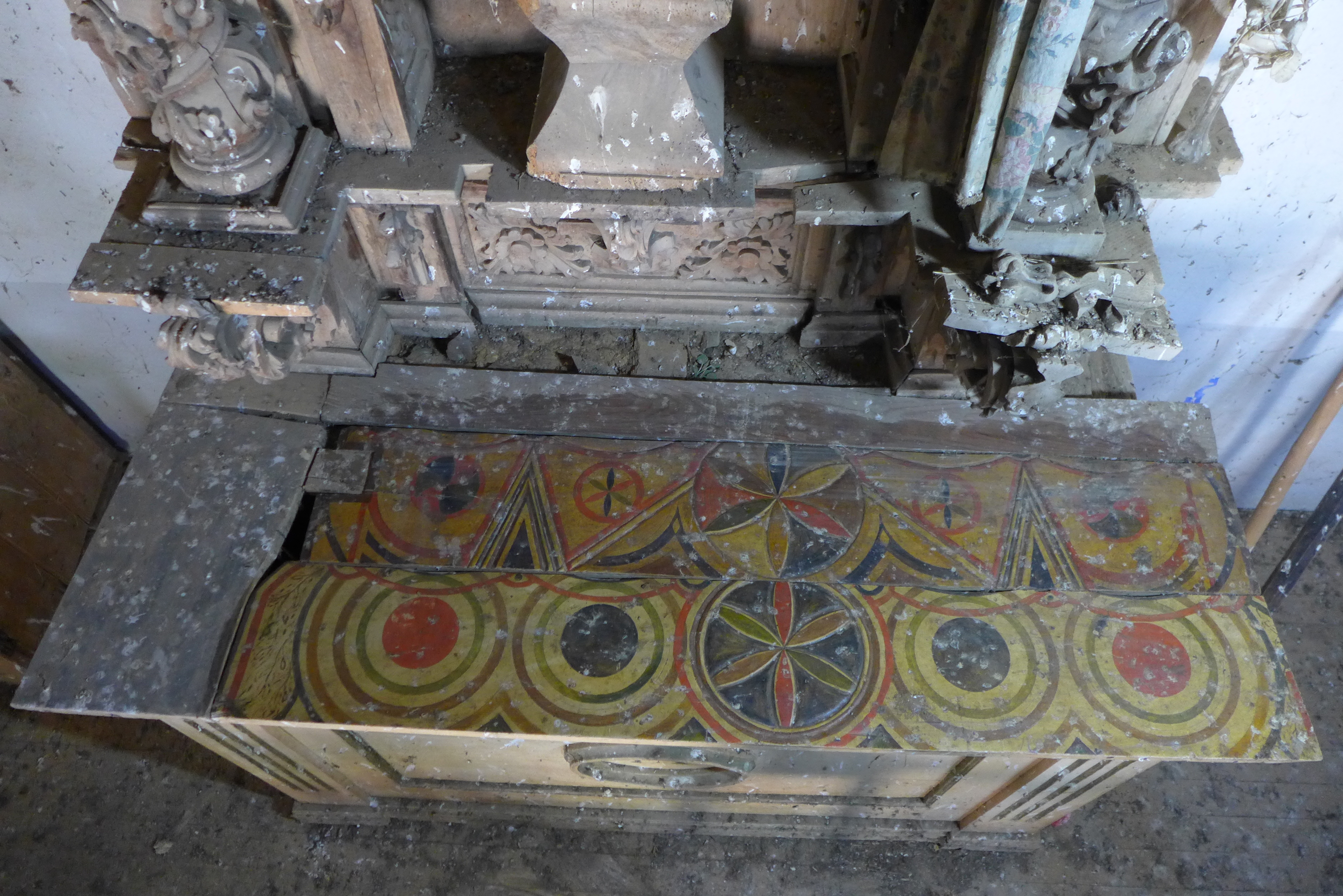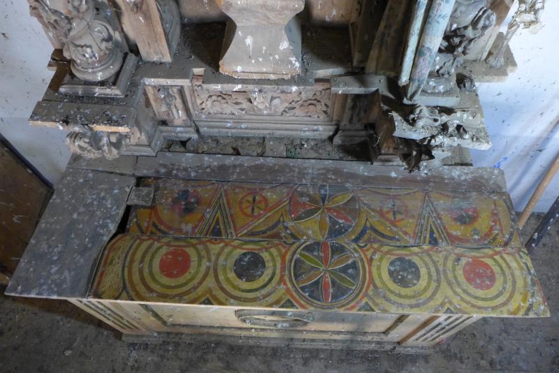 Su decoración pintada recuerda a la empleada en las partes principales del retablo mayor, lo que nos lleva a momentos muy avanzados del siglo XX.