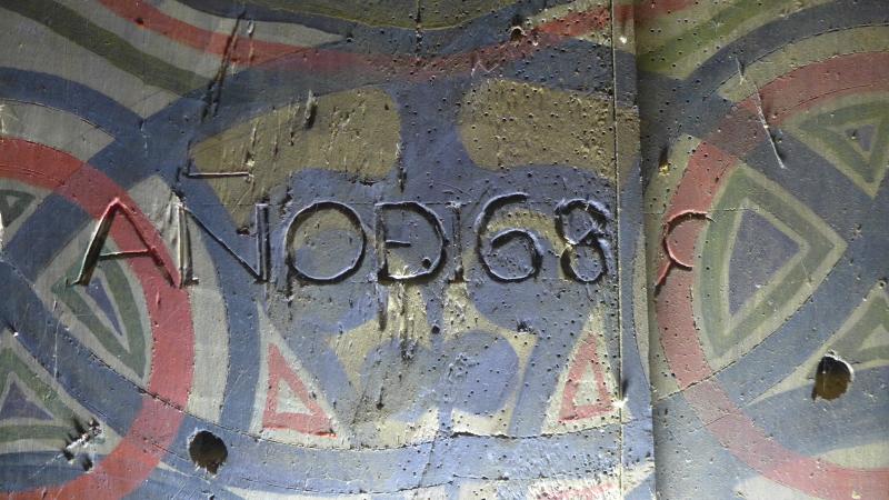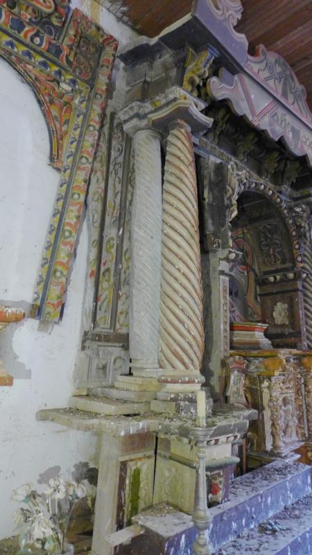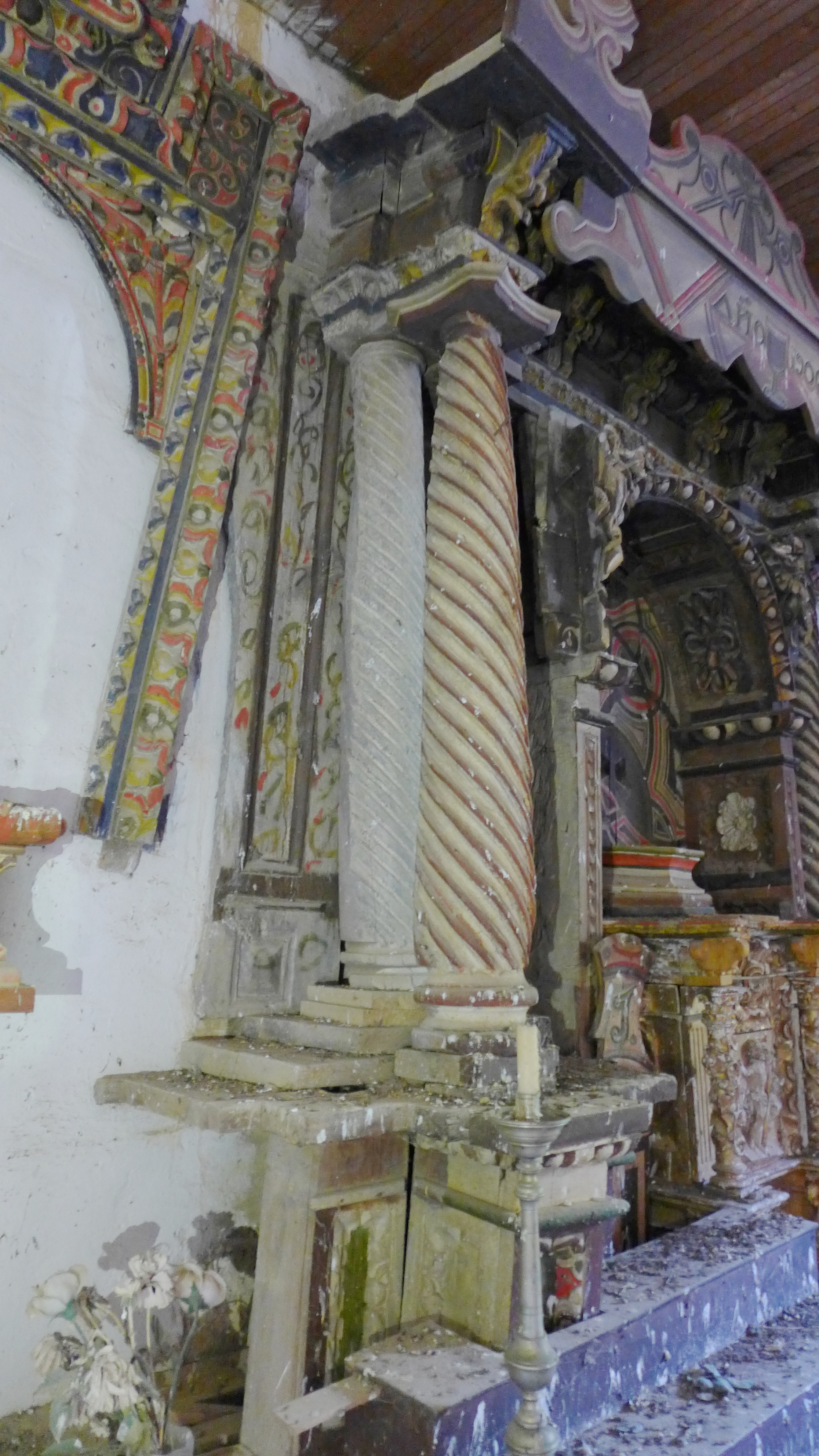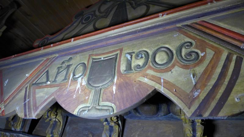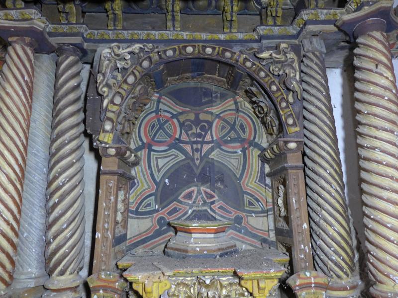 El fondo de la hornacina muestra unas tablas pintadas con decoración que no podemos definir sino de "psicodélica", a partir de motivos geométricos (círculos fundamentalmente) y lineas concéntricas, por más que esas tablas se datan en 1680.