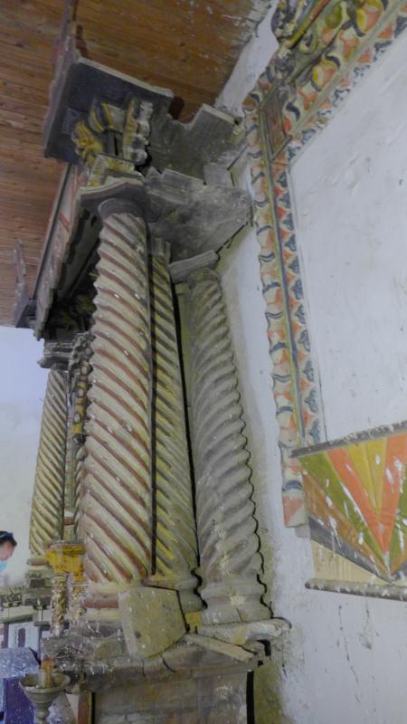 El cuerpo del retablo abre una hornacina de medio punto con frente del arco perlado y enjutas con golpes de talla. La hornacina apoya en unos elementos a modo de plintos en cuyos dos frentes llevan sendas letras pintadas: J, y A. (o M.) Flanquean la hornacina cinco removidas columnas entorchadas (sin capiteles), pues en uno de sus lados dispone de una suplementaria (en su color). Salvo una, el sentido del giro es siniestrógiro. Toda la estructura apoya en un banco que en realidad funciona como plinto de los elementos arquitectónicos que sustenta. Dos gradas elevan todo el conjunto, solo interrumpidas para disponer el tabernáculo.