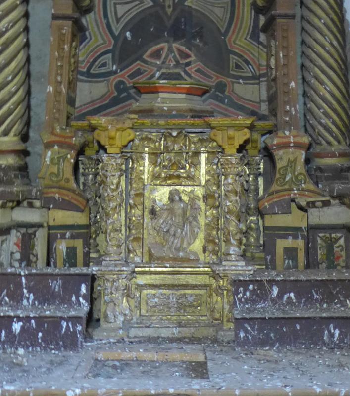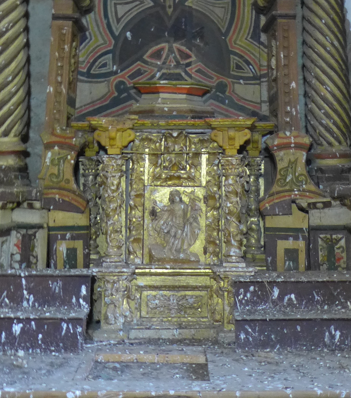 Mueble con entablamento recto y moldurado sostenido por dos pares de columnitas salomónicas decoradas con recargados tallos ascensionales de los que arrancan motivos vegetales y repuestas (e impropias) piezas a modo capiteles, en realidad toscas piezas ensambladas. Las dos columnas avanzadas flanquean la portezuela.