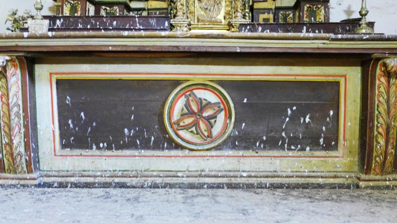 Pieza de madera compuesta de tablones unidos mediante listones por su parte posterior, no visibles. Entre dos estilizadas ménsulas laterales se acoge el tablero central, moldurado y pintado de color oscuro, en que destaca un círculo central a modo de clípeo donde se representa una flor cuatripétala, con chillona policromía.