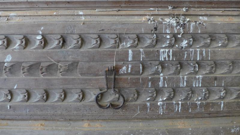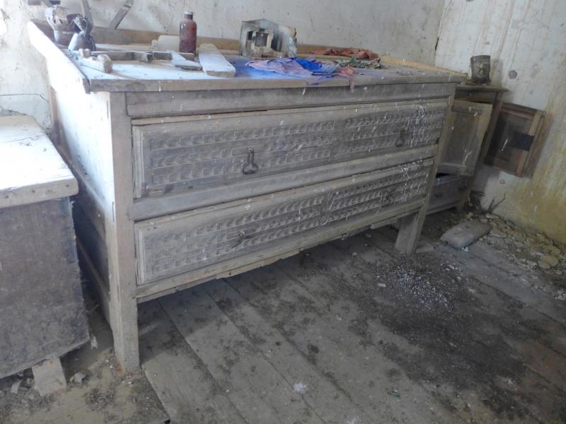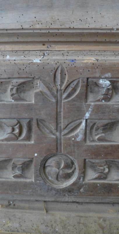 Mueble para guardar ornamentos y vestiduras litúrgicas. En este caso se trata de un sencillo modelo compuesto por dos únicos cajones que ocupan toda la superficie. Los cajones se decoran con tres hileras longitudinales de detalles seriados en relieve, obra de formón. Tales hileras se interrumpen con un motivo floral dispuesto sobre una cuatripétala inscrita en un círculo.