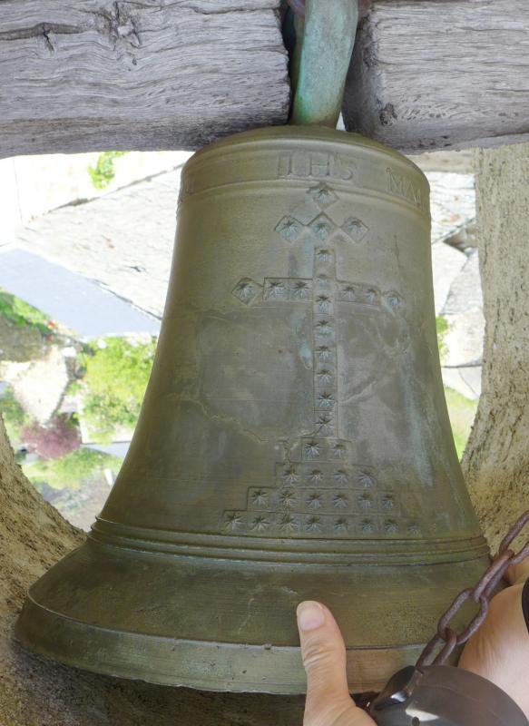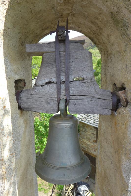 Campana de perfil esquilonado. Su tercio contiene la inscripción, enmarcada por dos cordones. En el medio exhibe una cruz de calvario que ocupa toda su altura, formada por moldes cuadrados en su basa, pie y brazos, y romboidales en los remates. Su pie se adorna con tres cordones. Conserva el badajo.