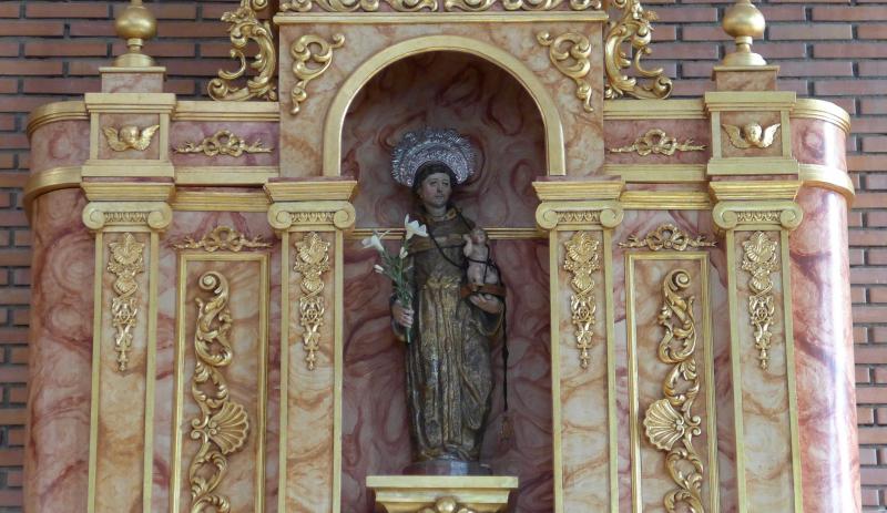 El santo, de cuerpo entero y de pie, viste hábito franciscano con estofado de pincel, cíngulo a la cintura con caída hasta los pies, y porta al Niño sentado sobre el libro (la Biblia) en su brazo izquierdo. La mano izquierda, actualmente, sostiene unos lirios (otro de sus atributos) de plástico. Su mirada es concentrada y se dibuja la sombra de barba y bigote.