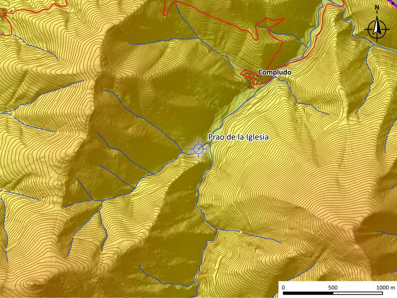 El espacio denominado Prao de la Iglesia se identifica con un terreno de pasto y árboles; es un terreno sobreelevado mediante un relleno de tierra, delimitado por muros de aterrazamiento.