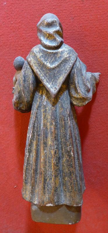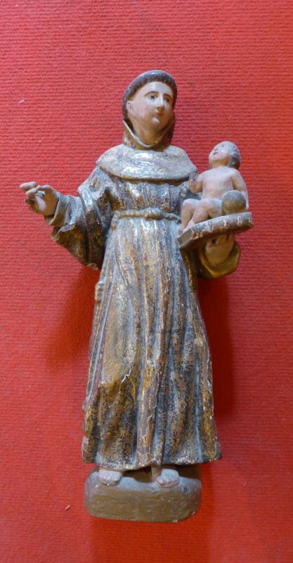 Escultura de bulto redondo con el santo representado conforme a su iconografía más habitual, de pie, vestido con hábito franciscano ceñido a la cintura por cíngulo, y con el Niño Jesús dispuesto sobre un libro en su mano izquierda, junto a una bola. Su mano derecha parece haber llevado algún otro atributo, perdido. Los rostros y paños resultan bastante populares, anodinos.
