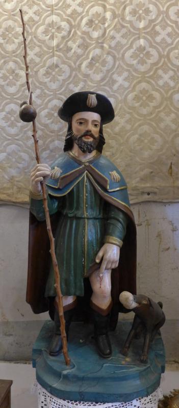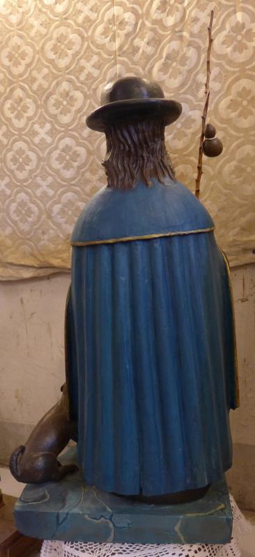 Talla popular, de modelo barroco, que muestra al santo de pie, con peana solidaria con la pieza que también sirve de base al perro que sostiene un panecillo en su boca.